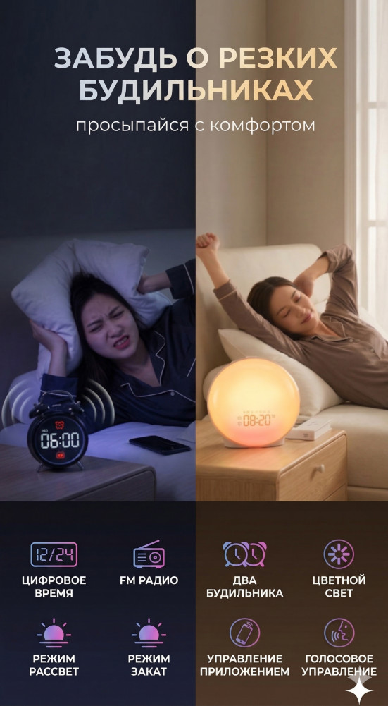 💳 Оплатить за товар можно при получении 🇰🇿 Есть бесплатная доставка по Казахстану от 1 дня 🎁 Копите бонусы с каждой покупки Умный будильник с имитацией рассвета — это современное решение для комфортного и мягкого пробуждения. Вместо резкого звука вы просыпаетесь под постепенное увеличение света, имитирующее естественный рассвет. Это помогает организму проснуться легче и без стресса. |