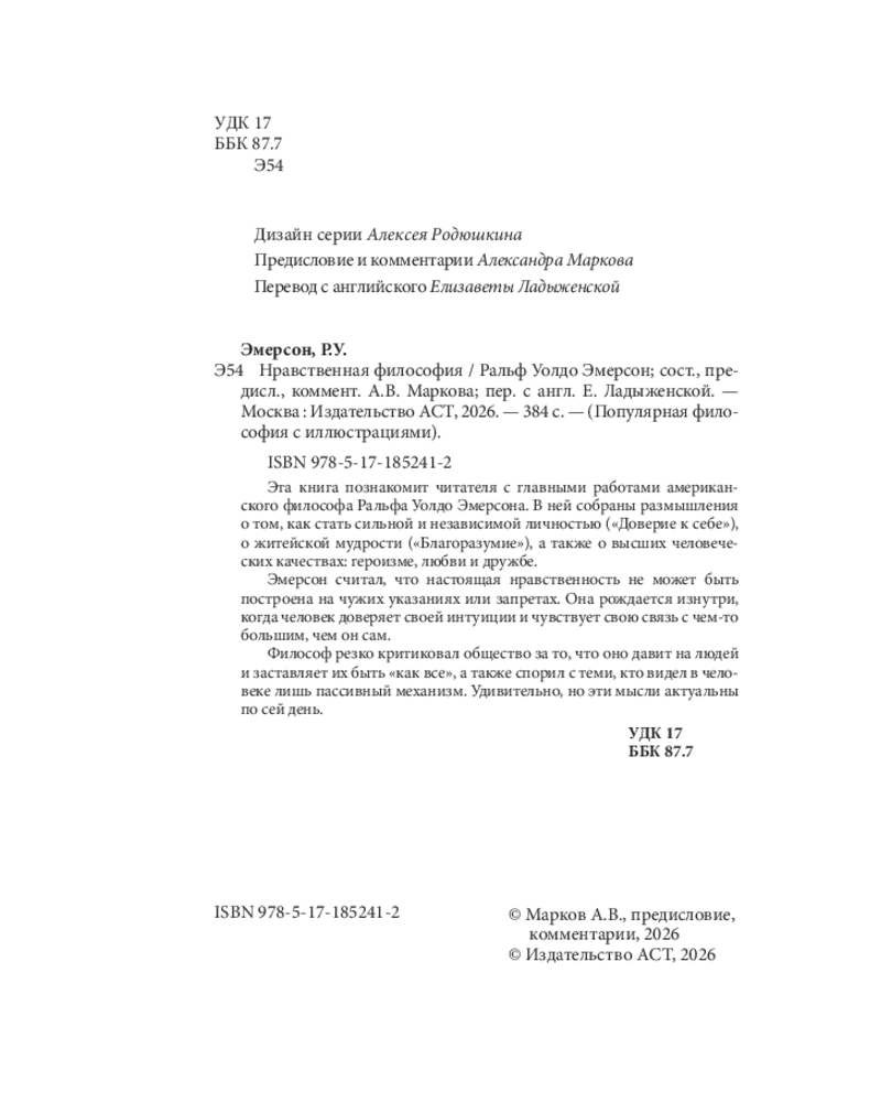 💳 Оплатить за товар можно при получении 🇰🇿 Есть бесплатная доставка по Казахстану от 1 дня 🎁 Копите бонусы с каждой покупки Серия: Популярная философия с иллюстрациями Эта книга познакомит читателя с главными работами американского философа Ральфа Уолдо Эмерсона. В ней собраны размышления о том, как стать сильной и независимой личностью («Доверие к себе»), о житейской мудрости («Благоразумие»), а также о высших человеческих качествах: героизме, любви и дружбе. |