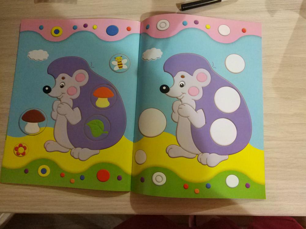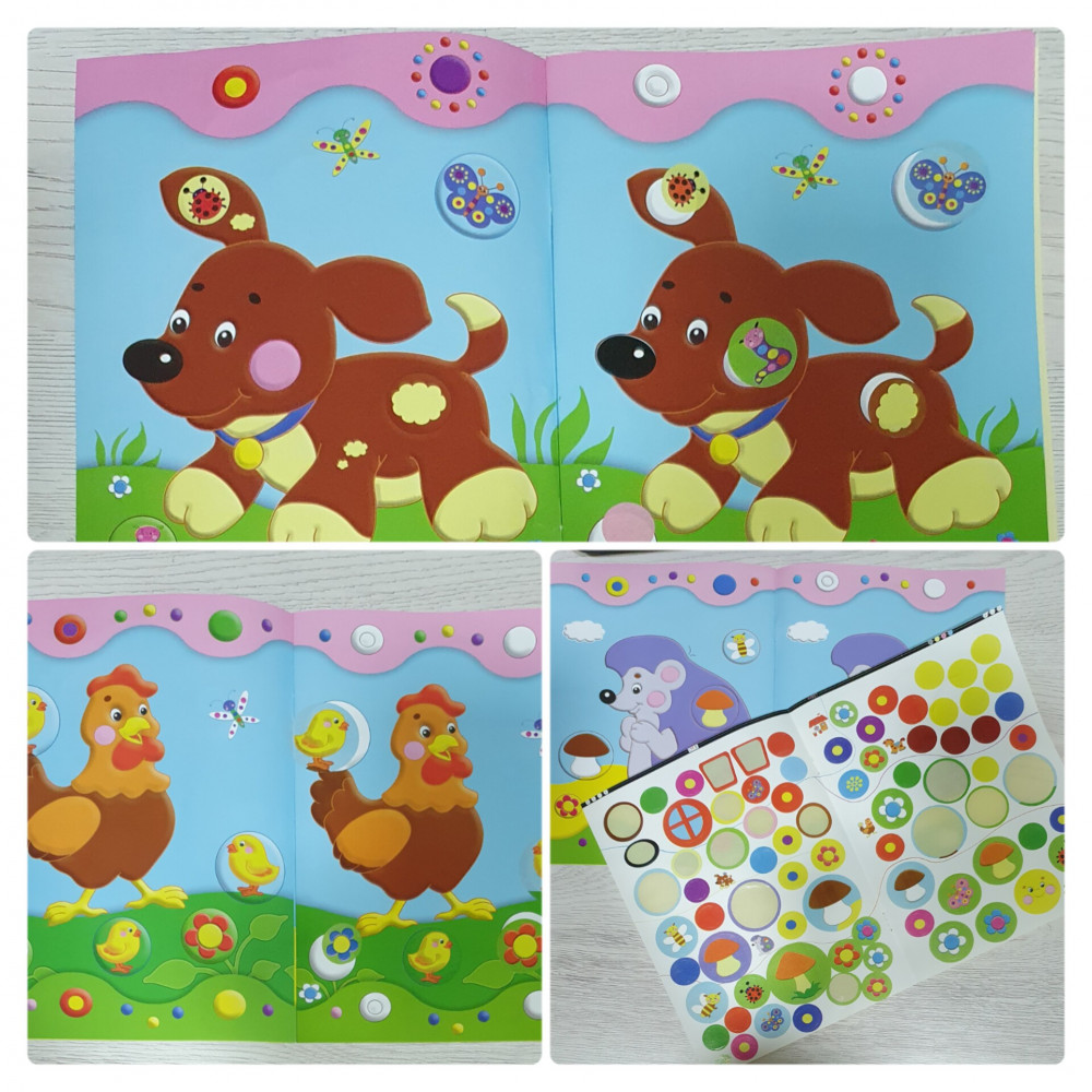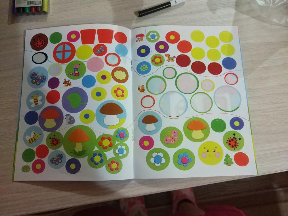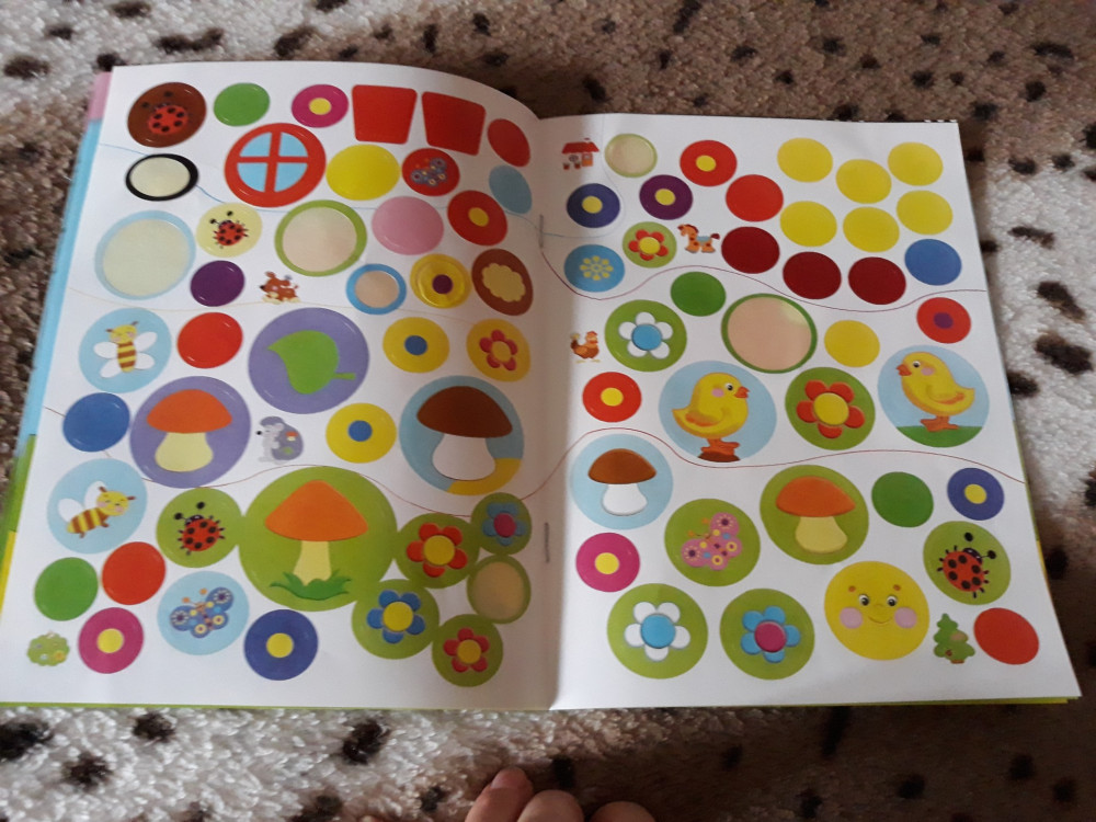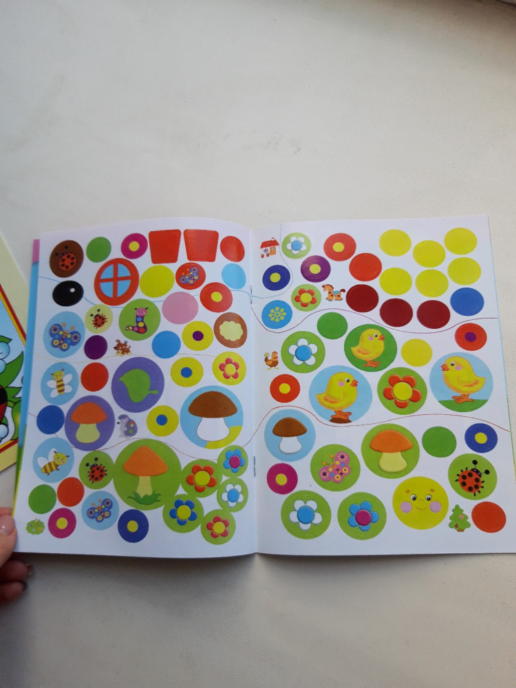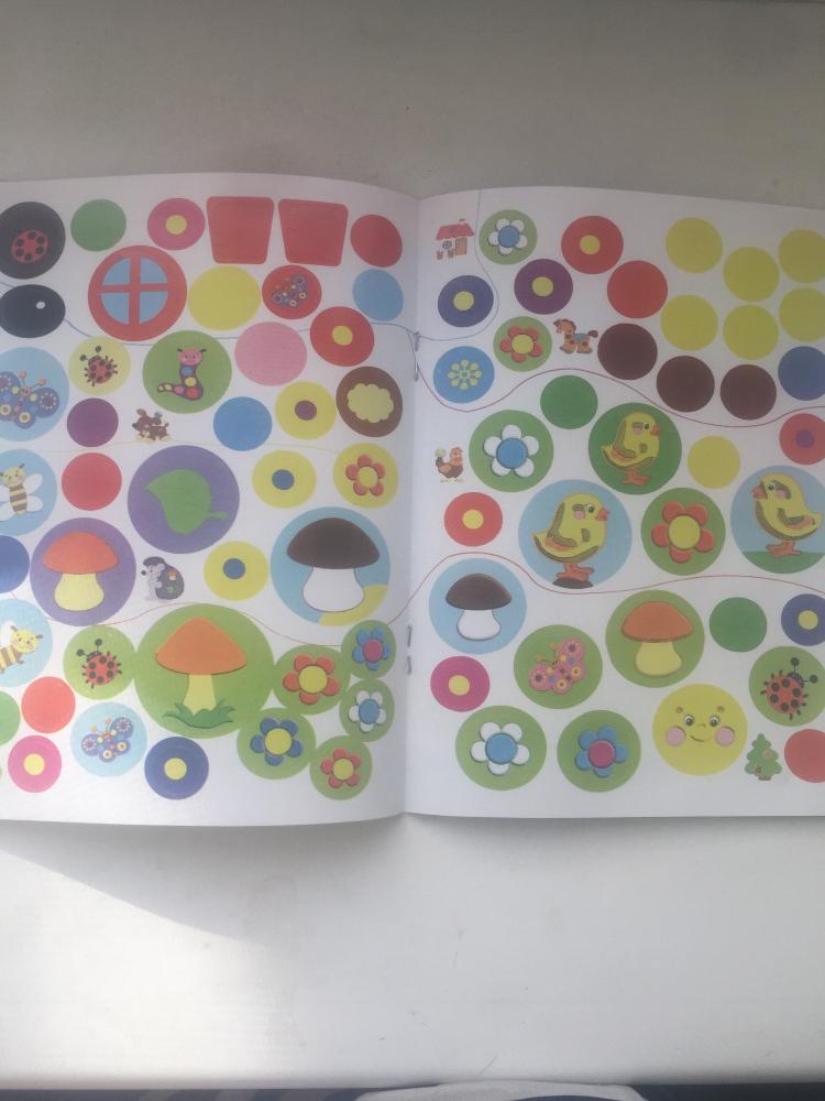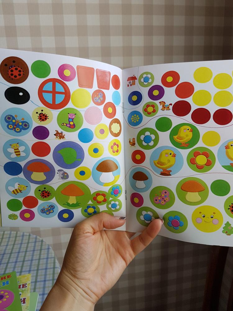Очень хорошая книжечка за копейки. Наклейки интересные, не просто кружки, а с бабочками, цветочками, грибочками.