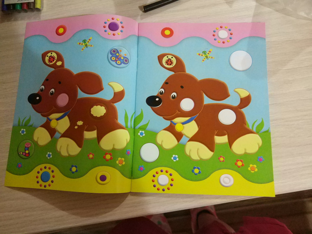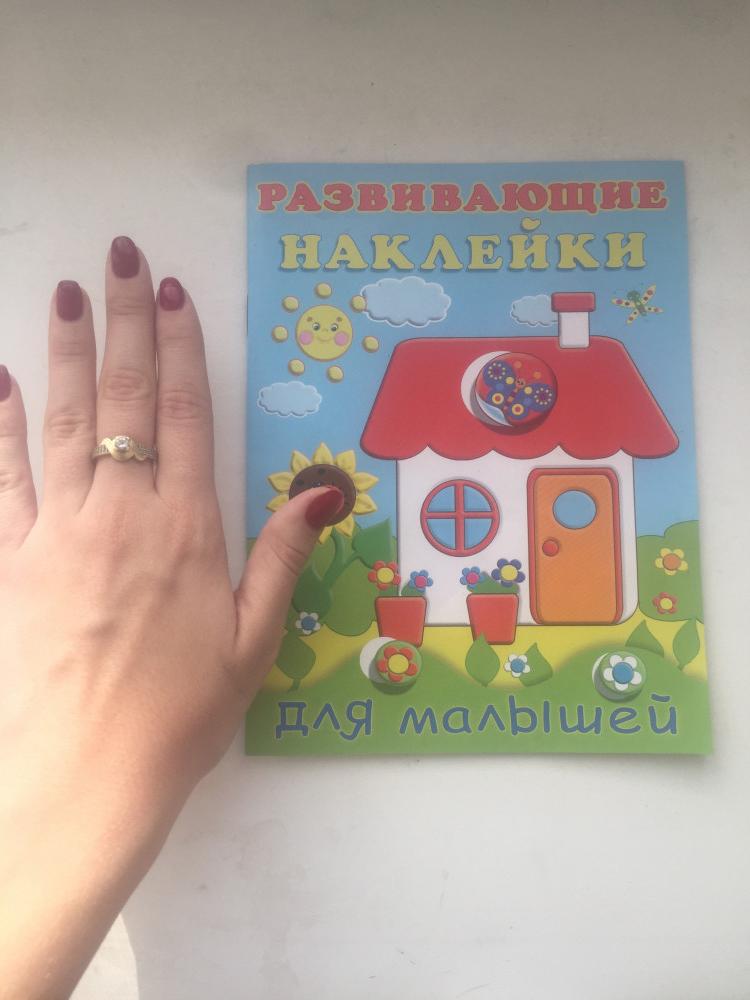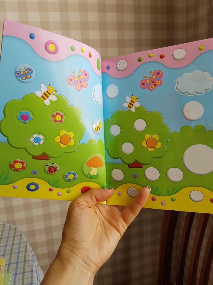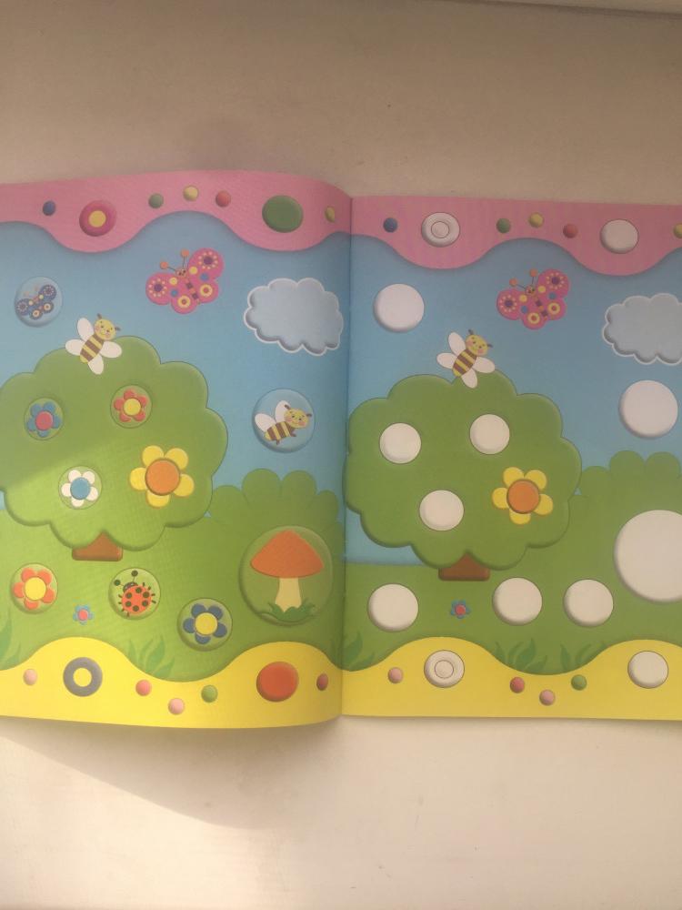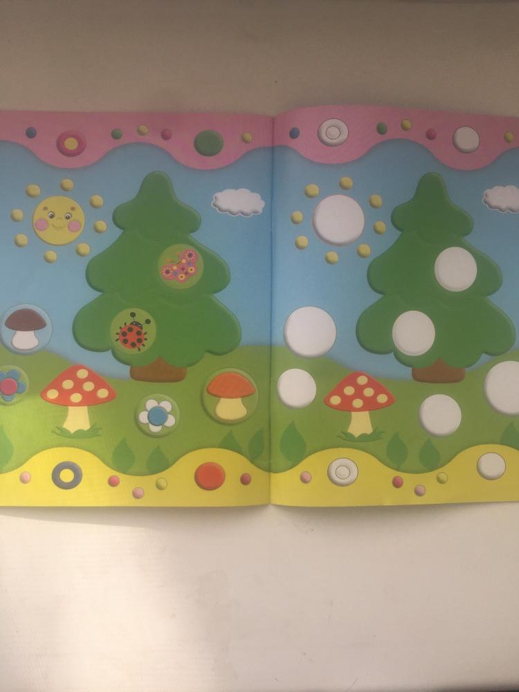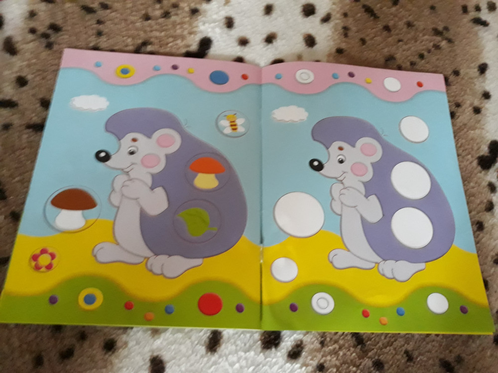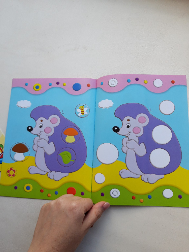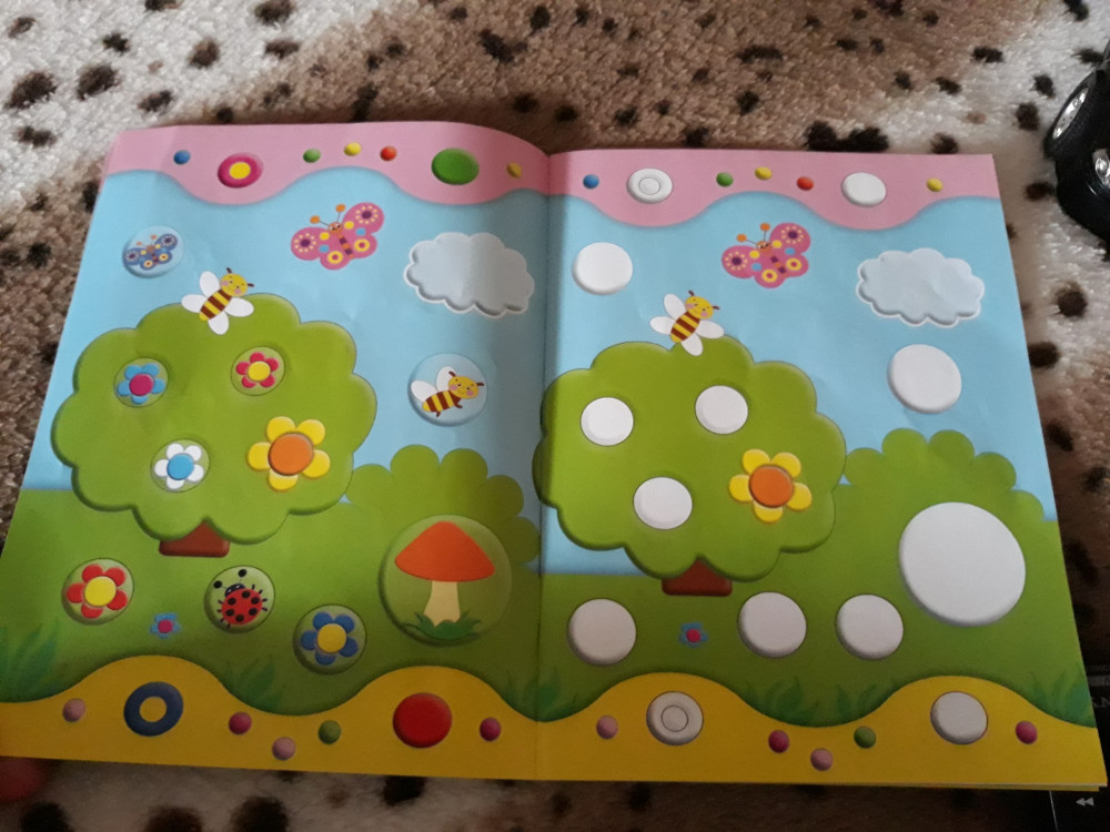 Очень хорошая книжечка за копейки. Наклейки интересные, не просто кружки, а с бабочками, цветочками, грибочками.