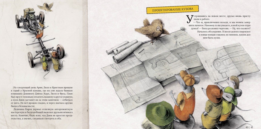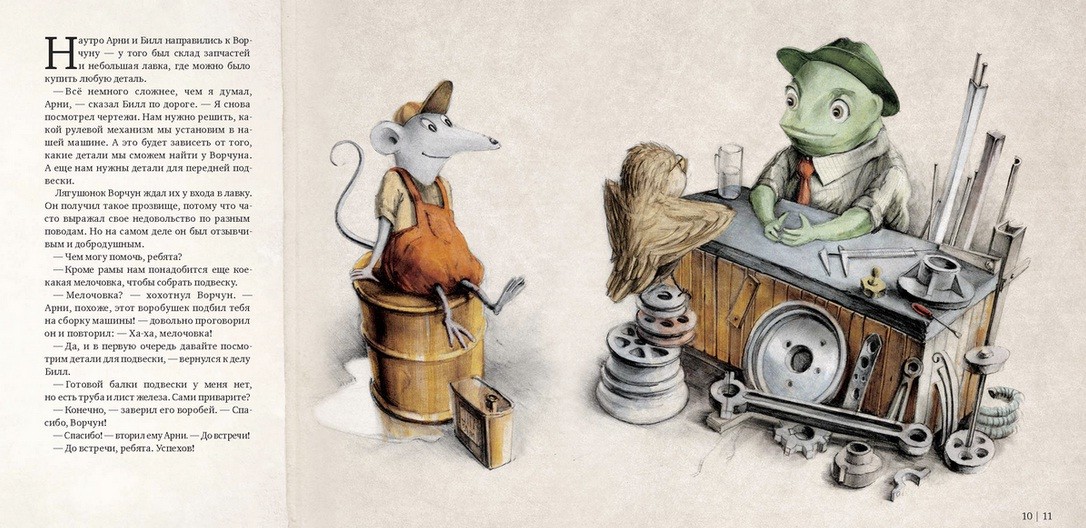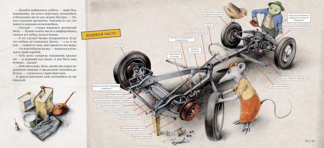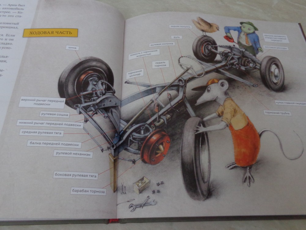 Издательство МИФ, во всех книгах серии по 60 страниц плотной, мелованной бумаги, обложка твёрдая матовая, шрифт... Хм.. Мелковат, но в книге указано "для чтения взрослыми детям") У меня книги из доп.тиражей, так что эти сказки пользуются спросом, надо полагать) Страницы и обложки искусственно состарены, но, в отличие от некоторых книг ИДМ, этим сказкам состаренность очень "идёт" - ведь в книгах полно чертежей, а сами герои работают в мастерской, так что следы от грязных пальцев, машинного масла и ещё кучи всего - привычное дело! Это история о двух друзьях - мышонке Арни и воробье Билле, и присоединившемся к ним лягушонке Кристиане (по совместительству - владельцу магазина, где можно купить много всего полезного и нужного). В первой части они собирают автомобиль, во второй - самолёт, в третьей - мотоцикл, а в четвёртой - настоящий дом (книга пока у меня в планах). Герои знакомятся, выясняют отношения с уличными ребятами, даже влюбляются! Сам сюжет, на мой взгляд, вторичен и служит только для связки объяснений по устройству техники, потому как просто читать "лекции" скучно и занудно (по крайней мере, для меня). Книга не для первого знакомства с транспортными средствами, а для уже "продвинутых" маленьких технарей - много терминов и деталей. Читать её нелегко... У нас происходит так: я читаю отрывок про себя, что-то бурчу под нос, вожу пальцев по картинкам рядом, чтобы разобраться, а потом читаю сыну, попутно показывая на иллюстрациях, что именно я читаю (откуда что попадает, куда идёт и что затем). Вряд ли я соглашусь на повторное чтение... Читать вслух неудобно ещё и потому, что реплики героев ооочень большие и читать по голосам не получается, да и сама я путаюсь порой, кто же это говорит? НО... Мой сын слушает с открытым ртом и когда я спрашиваю, всё ли понятно, отвечает, что, конечно, понятно, читай дальше! Вот я и думаю, может, я что-то в книгах не замечаю, что так нравится ребёнку? К слову сказать, я теперь знаю о принципах работы четырехтактного двигателя и понимаю, как происходит торможение! В каждой книге на специально отведённом месте можно вписать имя владельца) Форзацы цветные, иллюстраций очень много!