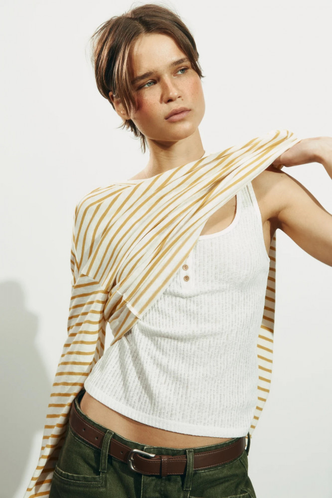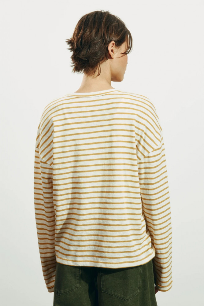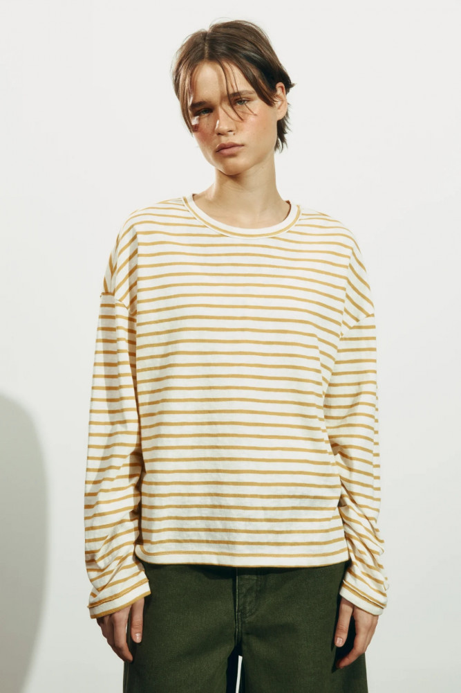 Женский лонгслив свободного кроя оверсайз из мягкой дышащей хлопковой ткани с гладкой трикотажной фактурой - Круглый вырез горловины. Длинные рукава с прямыми манжетами и спущенной линией плеча. Прямой нижний край без разрезов и декоративных элементов - Легкая хлопковая футболка с длинными рукавами для суперудобных кежуал-луков с любимым низом. Разбавь свои повседневные, спортивные, офисные, школьные или уличные аутфиты стильным базовым лонгсливом оверсайз в полоску, который станет неотъемлемой частью гардероба благодаря его универсальности. Дополни лук в стиле гардероба рыбака с низом из апрельской коллекции Befree Fisherman. Свободный хлопковый джемпер идеален для расслабленных повседневных луков, в которых тебе будет максимально комфортно как в жаркую, так и в прохладную погоду