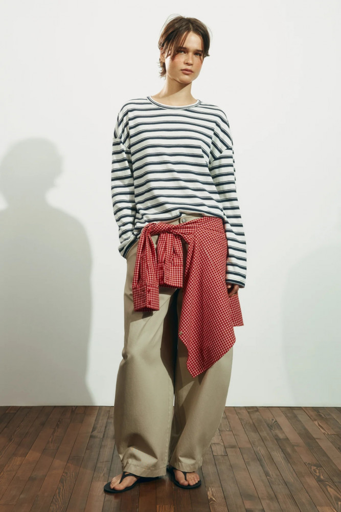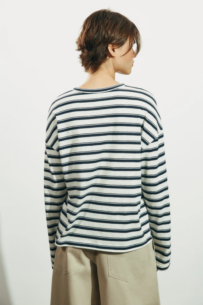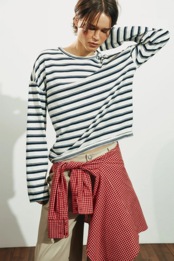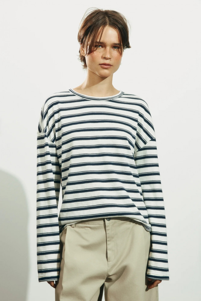 Женский лонгслив свободного кроя оверсайз из мягкой дышащей хлопковой ткани с гладкой трикотажной фактурой - Круглый вырез горловины. Длинные рукава с прямыми манжетами и спущенной линией плеча. Прямой нижний край без разрезов и декоративных элементов - Легкая хлопковая футболка с длинными рукавами для суперудобных кежуал-луков с любимым низом. Разбавь свои повседневные, спортивные, офисные, школьные или уличные аутфиты стильным базовым лонгсливом оверсайз в полоску, который станет неотъемлемой частью гардероба благодаря его универсальности. Дополни лук в стиле гардероба рыбака с низом из апрельской коллекции Befree Fisherman. Свободный хлопковый джемпер идеален для расслабленных повседневных луков, в которых тебе будет максимально комфортно как в жаркую, так и в прохладную погоду