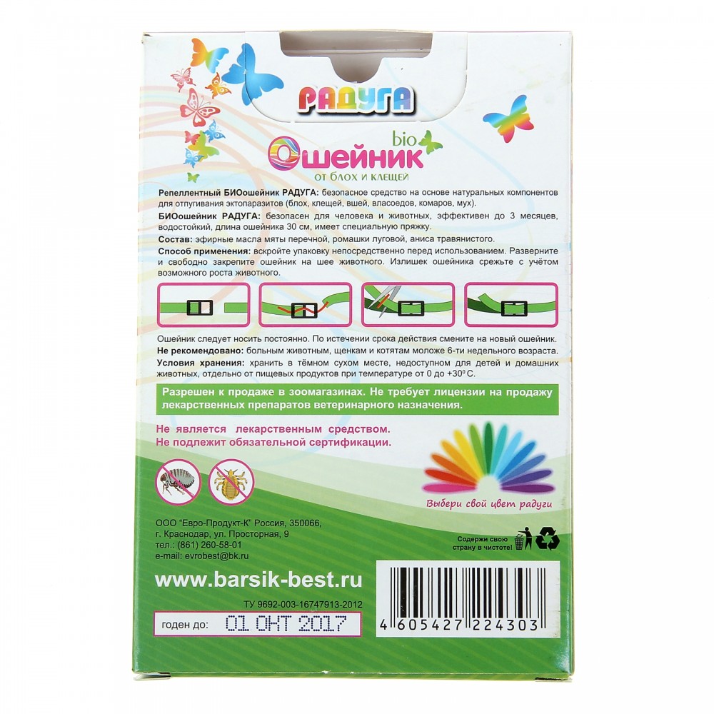 Репеллентный био-ошейник для котят и щенков «Радуга» от блох и клещей (длина 30 см), цвет в ассортиментеВ данный момент этот товар отсутствует в продаже. Возможно, у нас найдется аналогичный или похожий товар здесь. епеллентный ошейник «Радуга» пропитан высококачественными эфирными маслами – мяты перечной, ромашки луговой, аниса травянистого, пихты сибирской. Он эффективно защитит Вашего маленького питомца от клещей, блох, вшей, комаров, мух, власоедов. Абсолютно безопасен как для животных, так и для людей. |