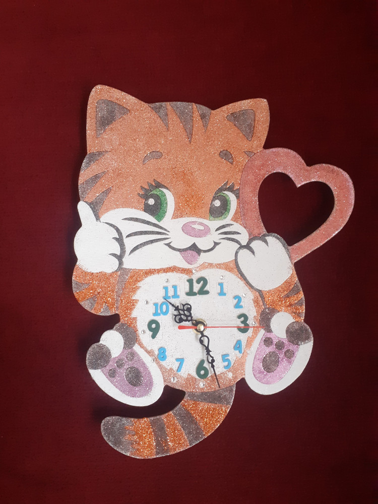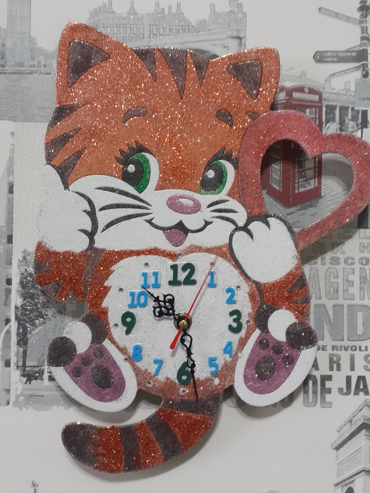 С девочками оформили картинку котёнка блестками и вставили часовой механизм. Получилось очень красиво!