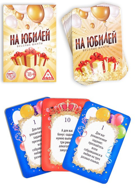 Купили данный набор для проведение игр на дне рождении бабушки, все очень понравилось плюсом стало то, что в фантах есть задания как для взрослых (так сказать для тусовки коллег), так и для детей (т.е. можно проводить фанты в кругу семьи).