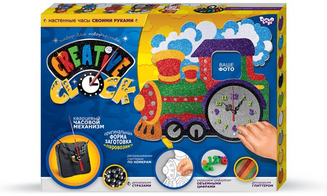 Кроме того, во время работы над часами детки смогут развивать свои творческие способности и креативность. Ведь работа предстоит сразу в нескольких направлениях: раскрашивание циферблата глиттером по номерам, декорирование стразами, украшение циферблата объемными цифрами и в завершение — сборка, настройка и присоединение часового механизма.