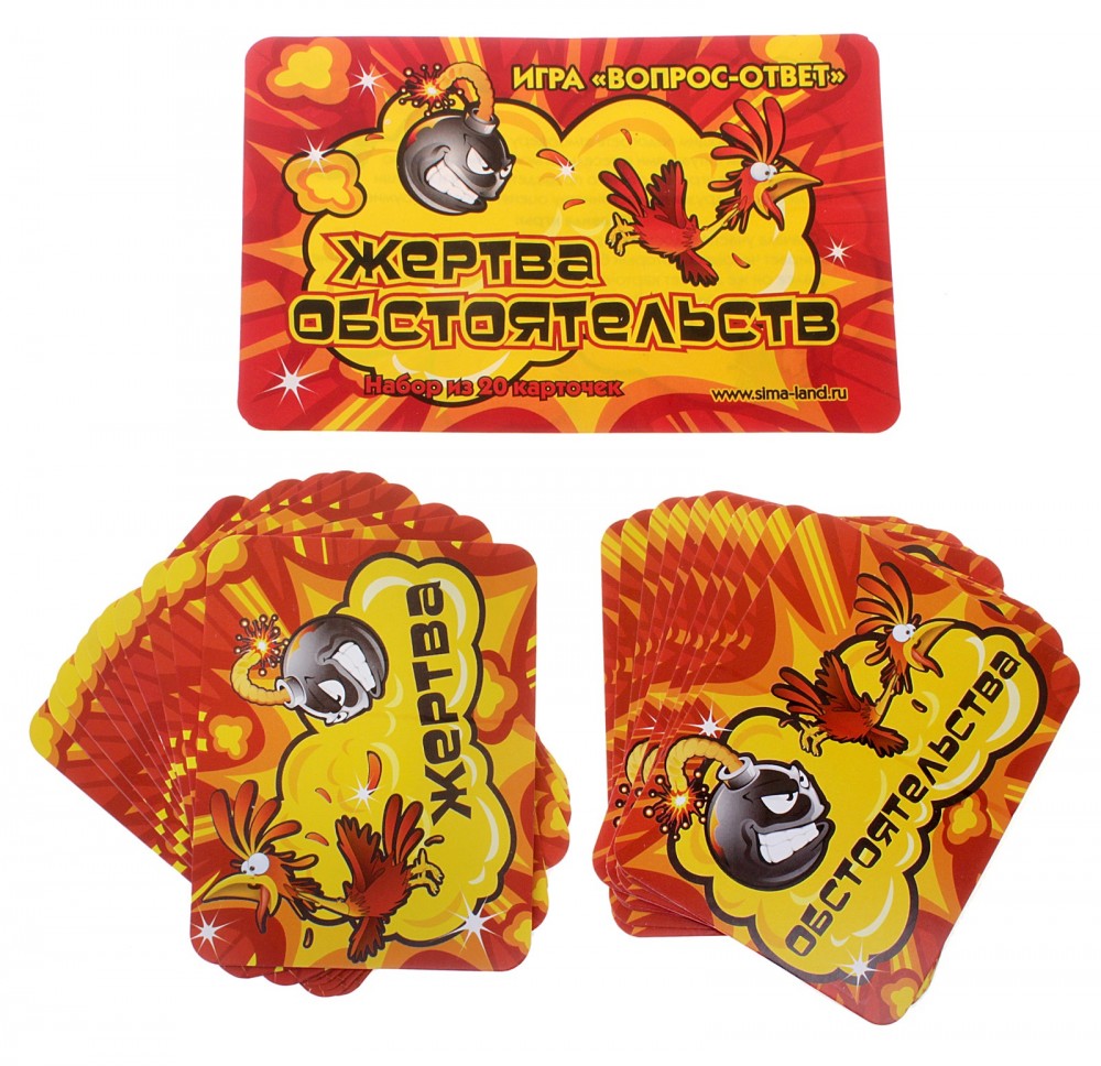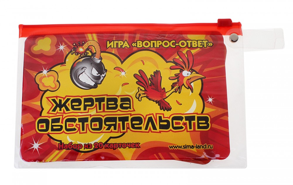 Игра вопрос-ответ «Жертва обстоятельств»В данный момент этот товар отсутствует в продаже. Возможно, у нас найдется аналогичный или похожий товар здесь. С игрой «Жертва обстоятельств» отличное настроение вам и вашим друзьям гарантировано! Игра содержит 20 карточек с веселыми вопросами и самыми неожиданными ответами, а также инструкцию с правилами игры. Подогрейте атмосферу вашей вечеринки забавными ситуациями и веселыми моментами, и она запомнится вам надолго! Вы отлично проведете время и от души посмеетесь, а друзья по достоинству оценят ваше остроумие! Удобная и крепкая |