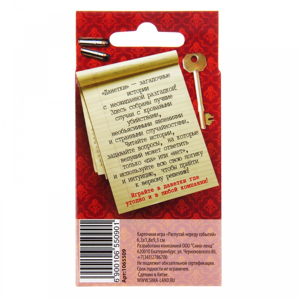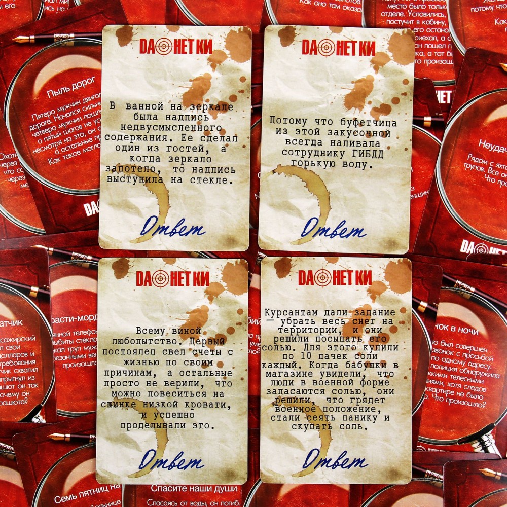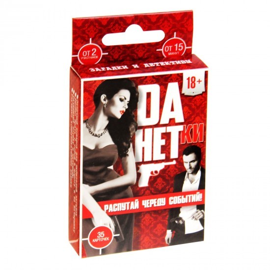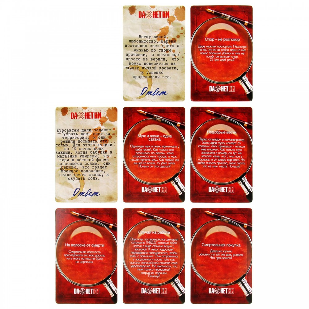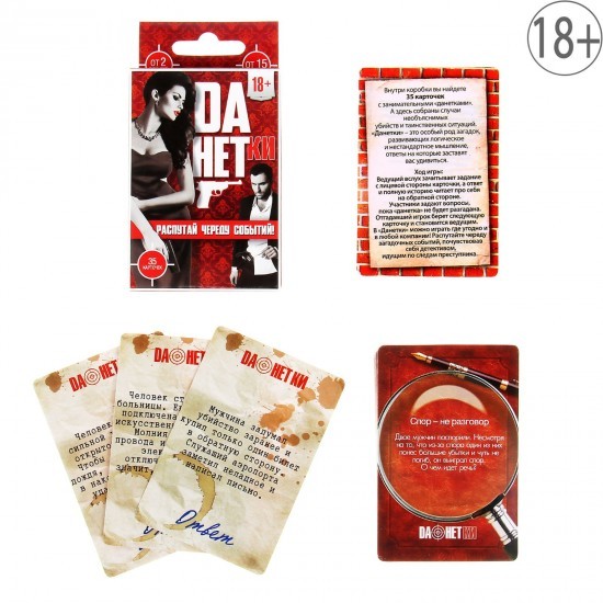 Играть в «данетки» очень просто — ведущий зачитывает часть запутанной истории, а отгадывающие должны восстановить всю ситуацию с помощью вопросов, на которые можно отвечать только «да» или «нет». Внутри коробки вы найдете 35 карточек с историями-«данетками», а отгадка заставит вас удивиться!