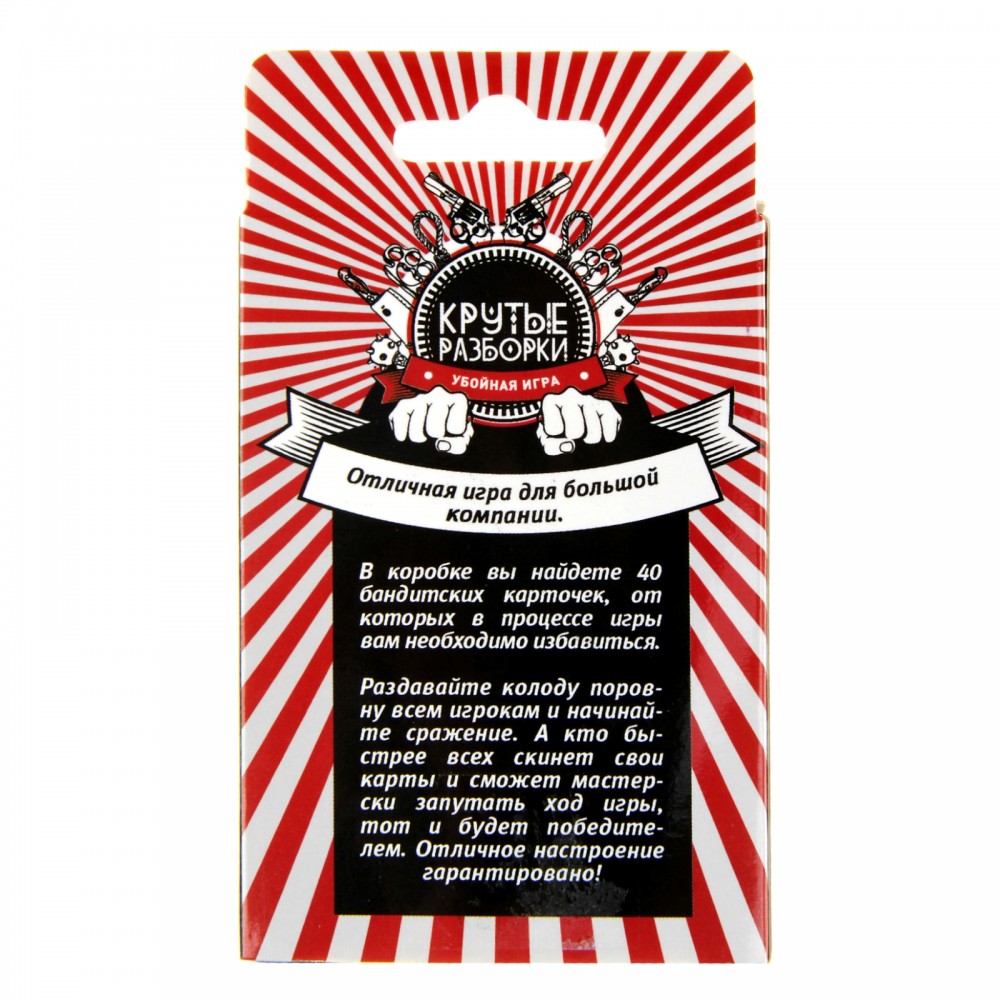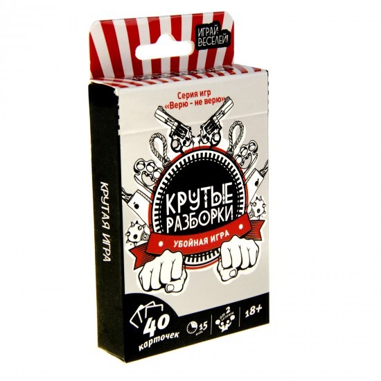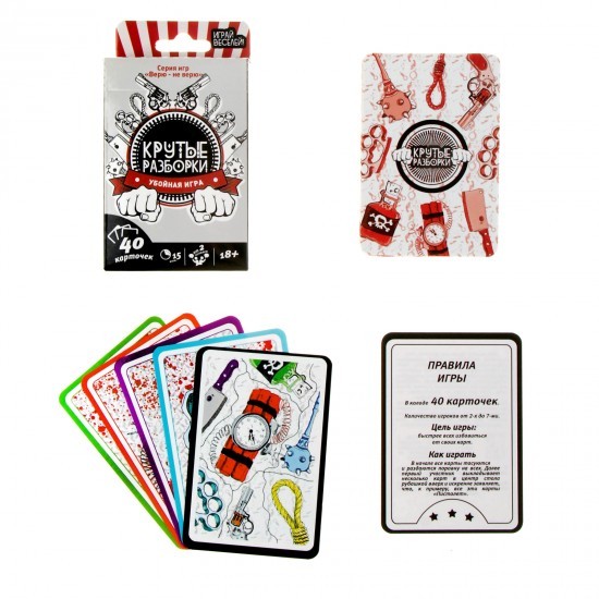 Лас Играс Игра с карточками «Крутые разборки»В данный момент этот товар отсутствует в продаже. Возможно, у нас найдется аналогичный или похожий товар здесь. На разборках всё пригодится! Крутые парни, когда идут на настоящие разборки, берут с собой и тесаки, и пистолеты, и даже бомбы! Попробуй избавиться от всех своих карт оружия раньше других игроков и одержать победу! Как играть? Всем игрокам раздается равное количество карт, выкладывая несколько карт на стол, вы вправе заявить, что на них изображено то или иное оружие, а остальные игроки могут вам поверить или заподозрить неладное. Если вы соврали и вас «выкупили», то забирайте все карты обратно в руку, если же вам поверили, то вы на шаг ближе к победе. Играйте, но, доверяя,- проверяйте! |