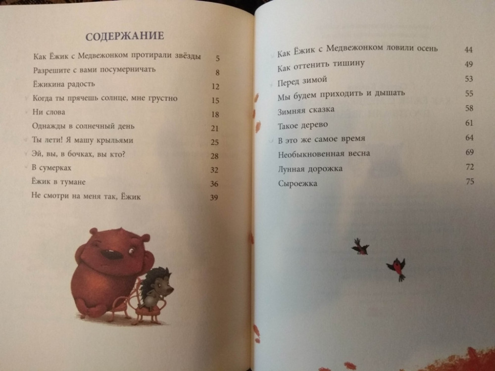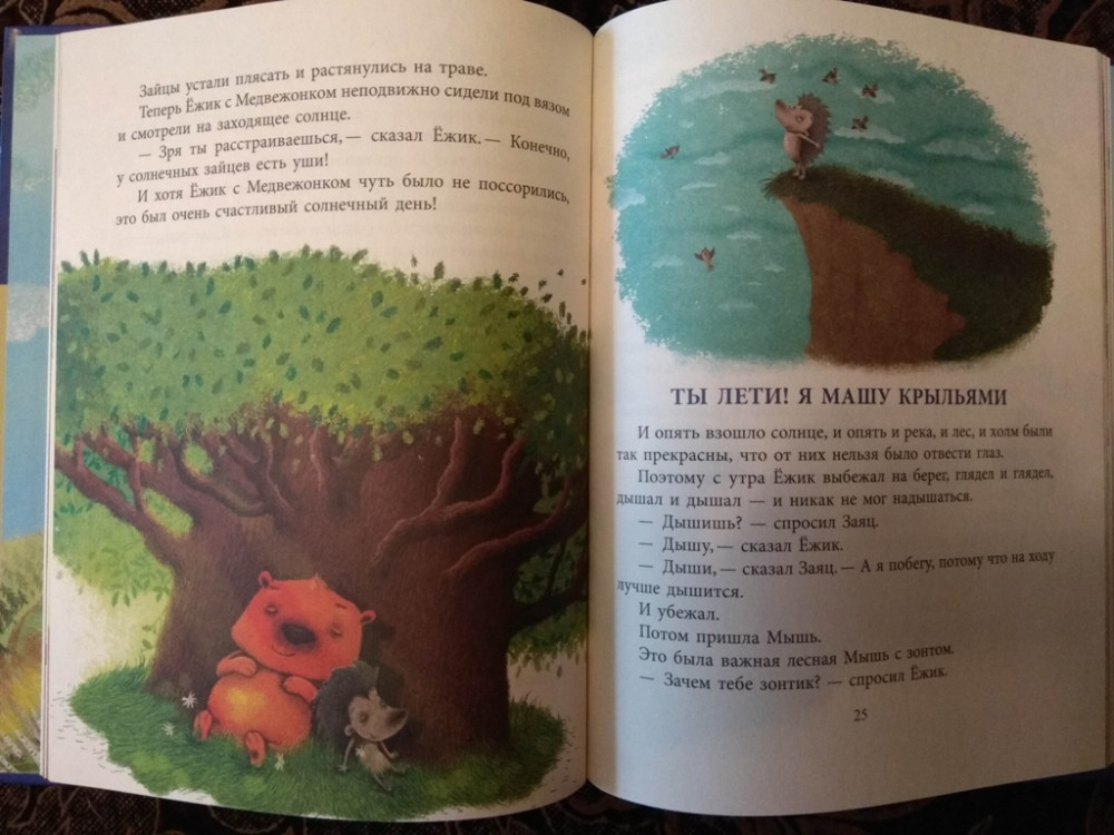Начну с того, что не так давно собираю Ёжиков и этот - четвертый в моей коллекции))) Теперь по пунктам: 1. Оформление. Небольшой квадратный формат в твердой лакированной обложке (я представляла размер больше и была немного удивлена), страницы мелованные, не просвечивают, шрифт комфортный, иллюстрации на каждом развороте. 2. Текст. В этой небольшой по размеру и толщине книжке я нашла самое большое количество историй про Ёжика и Медвежонка - целых 21!!! И тем радостней, что 13 новых, ранее мне не попадавшихся!!! 3. Иллюстрации. На мой взгляд - одни из самых лучших! Есть у меня и Лидия Шульгина, и Екатерина Лаврентьева, и , конечно, Евгений Антоненков! НО!!! В героев Оксаны Батуриной я влюбилась, так как только увидела фотографии книги в интернете! Они такие милые и озорные! Замечательны и форзацы - яркие и солнечные, сразу создают мечтательное настроение! Кстати, есть страничка, где можно вписать имя владельца книги) Подводя итог всему написанному, если Вы ищете книгу про знаменитую парочку друзей - рекомендую обратить внимание на данное издание!