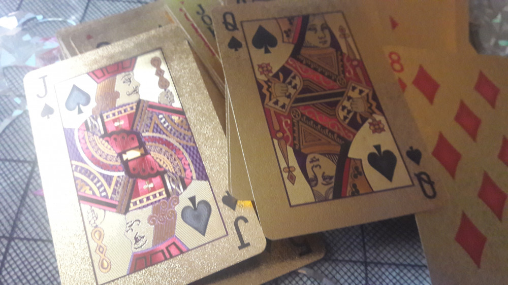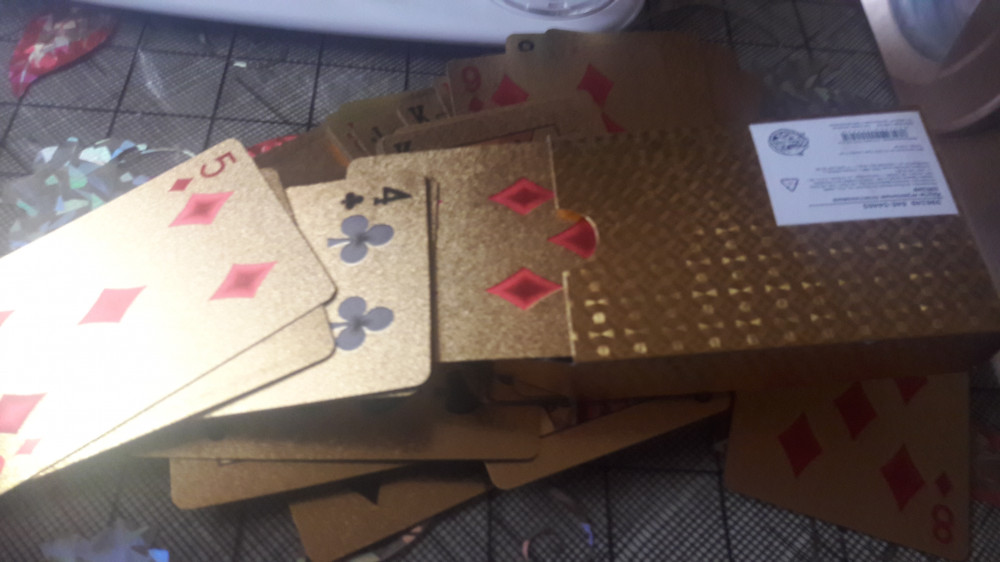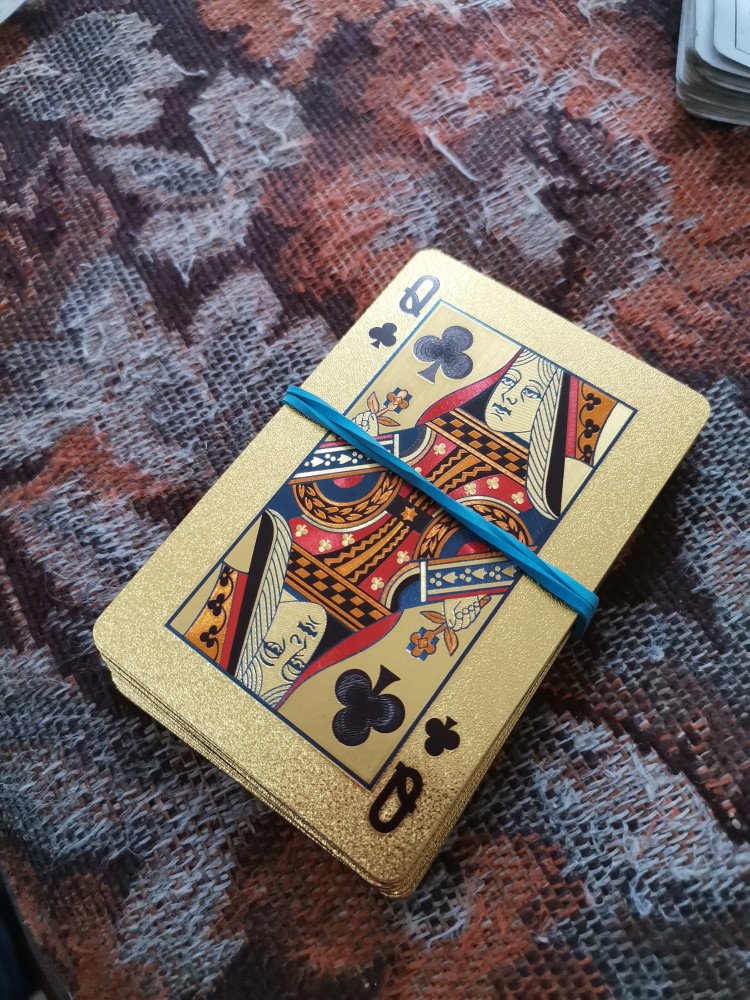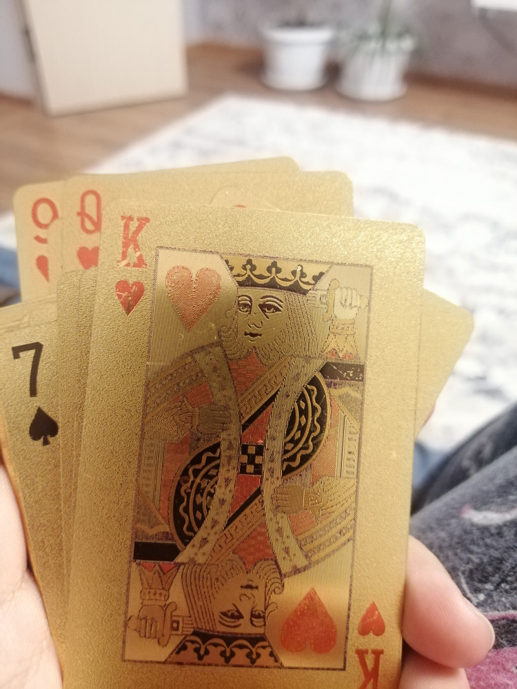Чёт не обратила внимание на фото в отзывах...Они такие золотые,что аж зайчики в глазах от люстры.Думала,что рубашки только золотые,а они с двух сторон сверкающие..Для гадания,трюков может и сгодится,а вот для игры...Очень бликуют.Может,потому, что я в очках? Придется играть в покер в затемнённых очках)А так выглядят круто,качество хорошее .