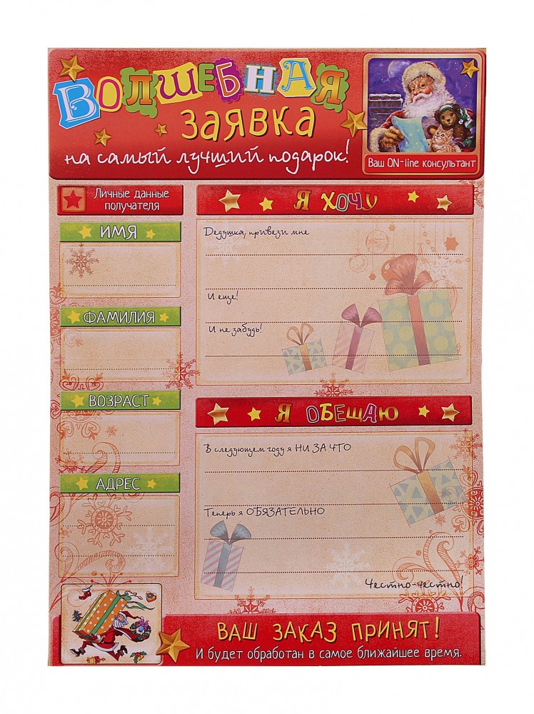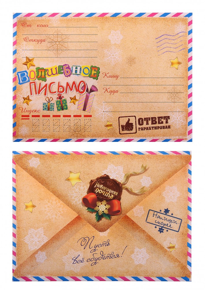 Письмо новогоднее с конвертом «Волшебная заявка»В данный момент этот товар отсутствует в продаже. Возможно, у нас найдется аналогичный или похожий товар здесь. У каждого есть заветное желание. Как узнать Деду Морозу о том, что же вы мечтаете получить в подарок. У нас есть решение! Письмо новогоднее с конвертом «Дедушке Морозу» в эксклюзивном дизайне донесёт ваше послание, и оно непременно исполнится. Настоящий ответ от Деда Мороза можно получить только в случае, если письмо будет отправлено по всем требованиям волшебной почты (в конверте и с почтовыми марками) по таким адресам: |