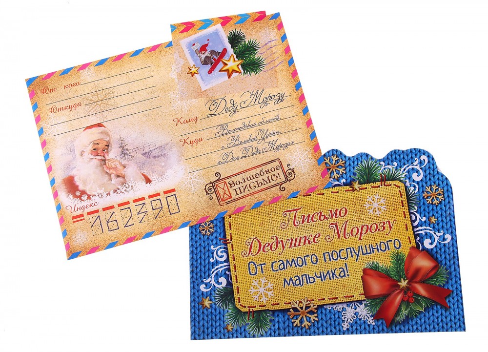 Письмо новогоднее с конвертом «От мальчика»В данный момент этот товар отсутствует в продаже. Возможно, у нас найдется аналогичный или похожий товар здесь. У каждого есть заветное желание. Как узнать Деду Морозу о том, что же вы мечтаете получить в подарок. У нас есть решение! Письмо новогоднее с конвертом «Дедушке Морозу» в эксклюзивном дизайне донесёт ваше послание, и оно непременно исполнится. Настоящий ответ от Деда Мороза можно получить только в случае, если письмо будет отправлено по всем требованиям волшебной почты (в конверте и с почтовыми марками) по таким адресам: |