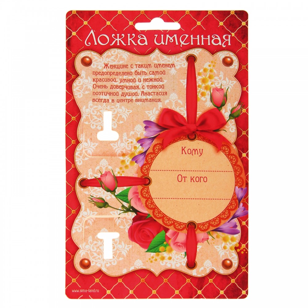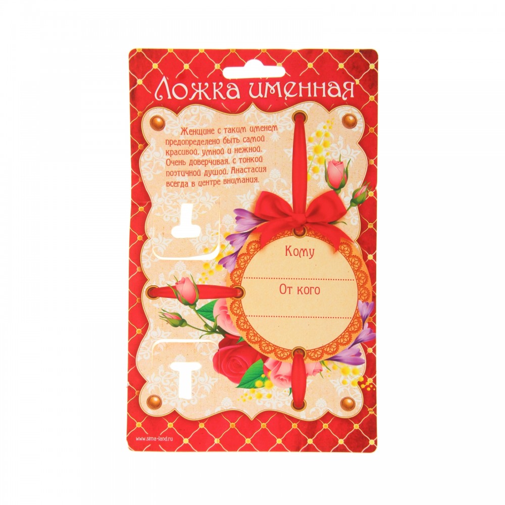 Ложка на открытке «Анастасия»В данный момент этот товар отсутствует в продаже. Возможно, у нас найдется аналогичный или похожий товар здесь. Именная ложка — это не только функциональный подарок на день рождения, профессиональный праздник или в любой другой день, но и оригинальный предмет интерьера. Надпись нанесена на черпак при помощи лазера, на рукоятке ложки — золотой узор. Дизайнерское оформление открытки позволит выбрать подарок по случаю и торжественно вручить его адресату. |