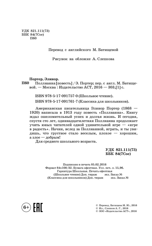 ПоллианнаВ данный момент этот товар отсутствует в продаже. Возможно, у нас найдется аналогичный или похожий товар здесь. Серия: Школьное чтение Американская писательница Элеонор Портер (1868–1920) написала в 1913 году повесть «Поллианна». Книгу ждал ошеломительный успех и долгая жизнь. И сегодня, спустя сто лет, одиннадцатилетняя Поллианна продолжает учить юных читателей одной удивительной игре — «игре в радость». Начни, вслед за Поллианной, играть, и ты увидишь, что грустное стало веселым, плохое — хорошим, а злое — добрым! |
