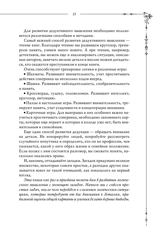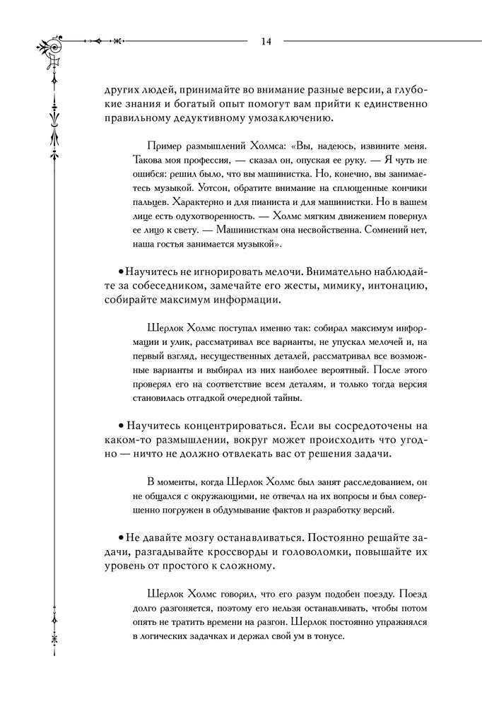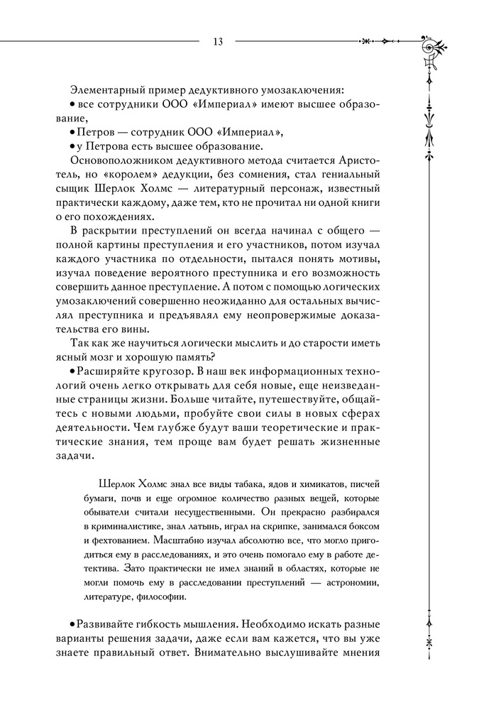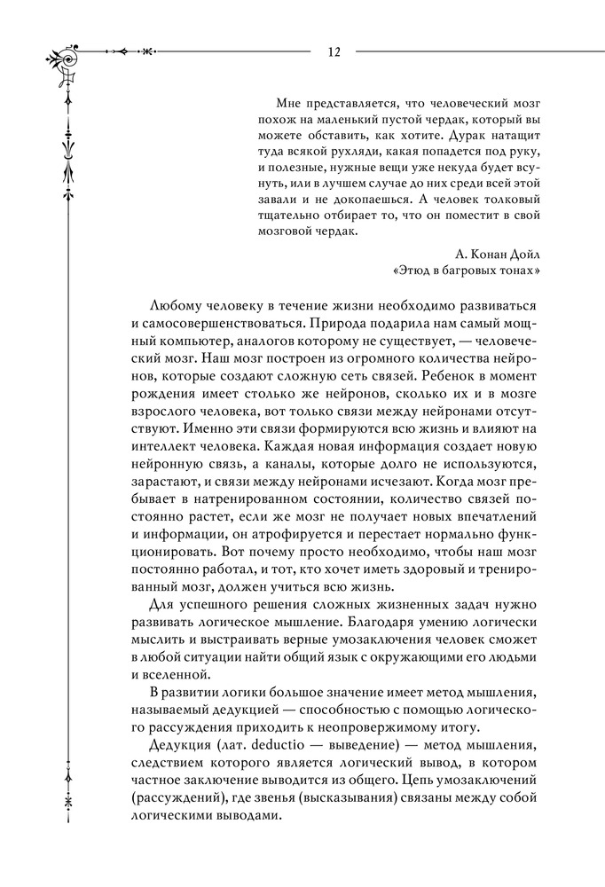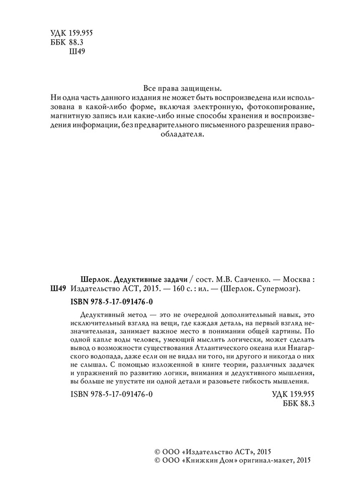 Шерлок. Дедуктивные задачиВ данный момент этот товар отсутствует в продаже. Возможно, у нас найдется аналогичный или похожий товар здесь. Серия: Шерлок. Супермозг Дедуктивный метод — это не очередной дополнительный навык, это исключительный взгляд на вещи, где каждая деталь, на первый взгляд незначительная, занимает важное место в понимании общей картины. По одной капле воды человек, умеющий мыслить логически, может сделать вывод о возможности существования Атлантического океана или Ниагарского водопада, даже если он не видал ни того, ни другого и никогда о них не слышал. Шерлок Холмс — настоящий символ дедуктивного метода мышления. Однако мало кто знает, что прототипом знаменитого сыщика стал профессор медицины Эдинбургского университета Джозеф Белл, который оказывал помощь полиции, блестяще применяя свой дедуктивный метод. С помощью изложенной в книге теории, различных задачек и упражнений по развитию логики, внимания и дедуктивного мышления вы больше не упустите ни одной детали и разовьете гибкость мышления. Методы гениального сыщика и его секреты успеха уже у вас в руках. |