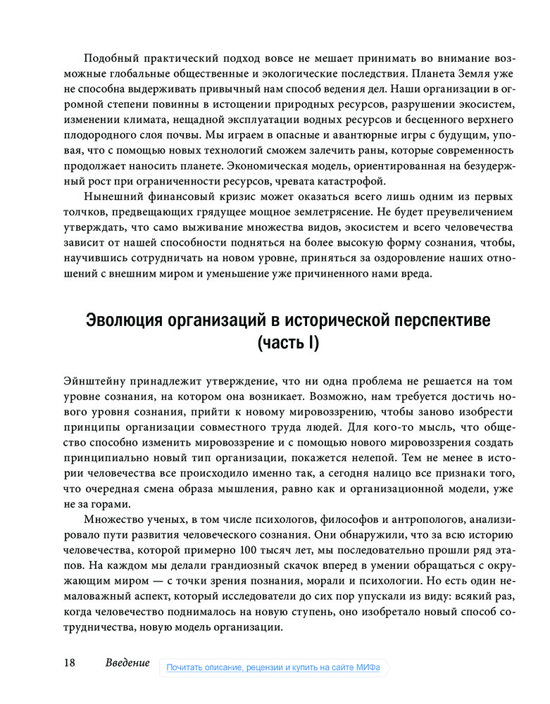 В первой части книги автор предлагает масштабный исторический обзор эволюции организационных парадигм. В ней поясняется, что всякий раз, когда человечество устремляется к новому уровню сознания, оно изобретает принципиально более продуктивную организационную модель. Являемся ли мы свидетелями этого решающего этапа сегодня? Готовы ли мы к такому скачку?