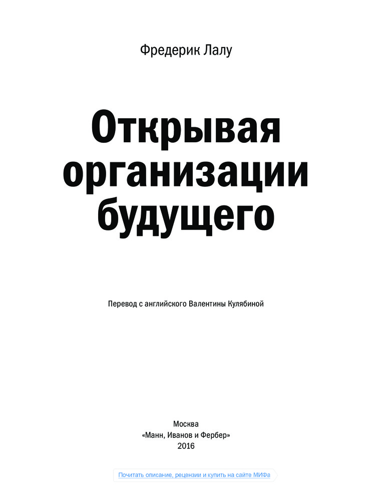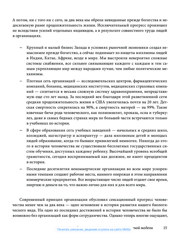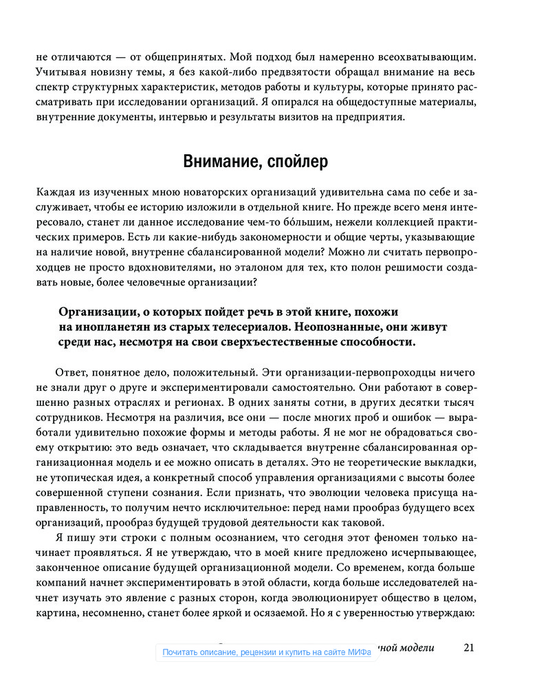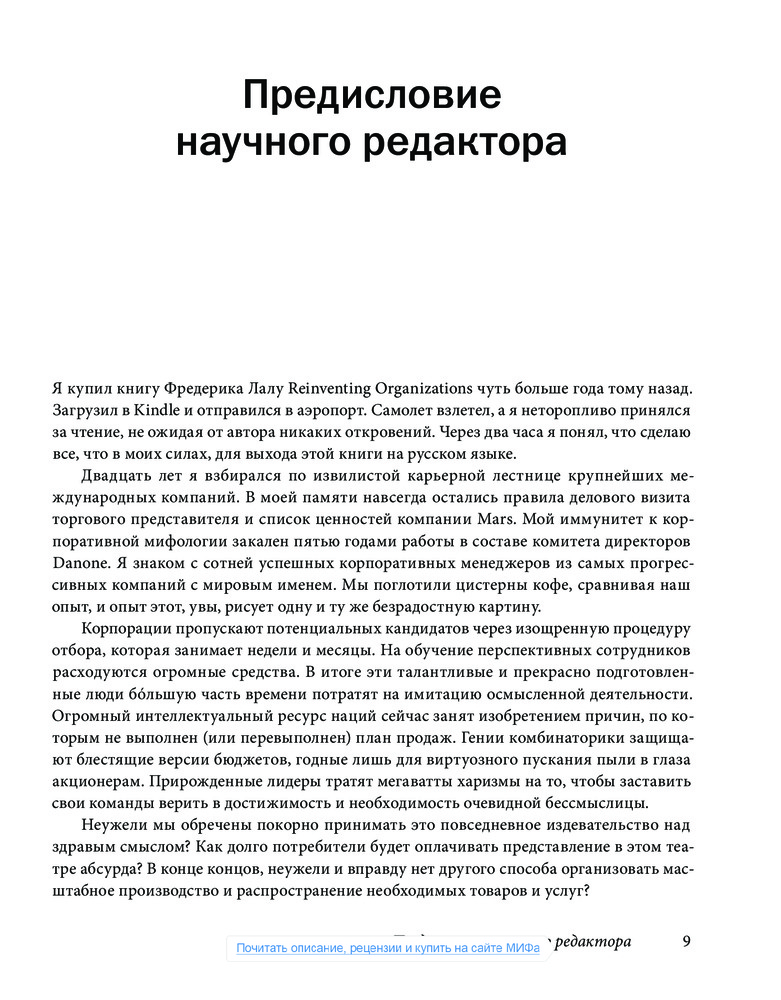 Мы стремимся к чему-то большему, к принципиально новым и лучшим способам организации совместной работы людей. Но действительно ли такое возможно или это просто несбыточные мечты? Если все-таки организации, способные более полно раскрывать потенциал человека, могут быть созданы, то как они должны выглядеть? Как вдохнуть в них жизнь? Вот вопросы, лежащие в основе этой книги.