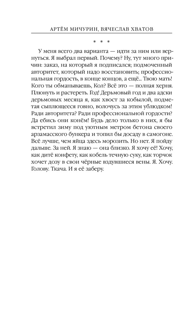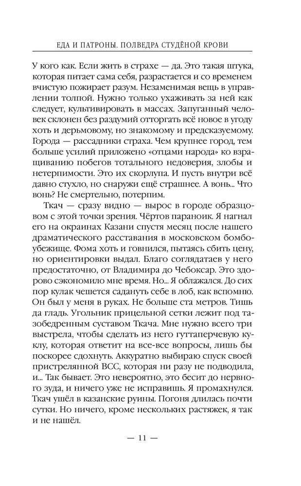 Логическое продолжение 3-ей части "Еда и патроны" не такое яркое, каким ожидалось. Стиль повествования сохранен, но, может, не такой динамичный и захватывающий. Сложилось впечатление, что у автора (Мичурин) не хватило таланта для завершения тетралогии, поэтому он привлек для этого еще одного писателя (Хватов). Правда от этого тандема и есть плюсы: стало больше философских размышлений главного героя, которые заставляют задуматься. В целом, книга стоит того, чтоб её прочитали, хотя бы для того чтобы узнать что стало с Коллекционером.