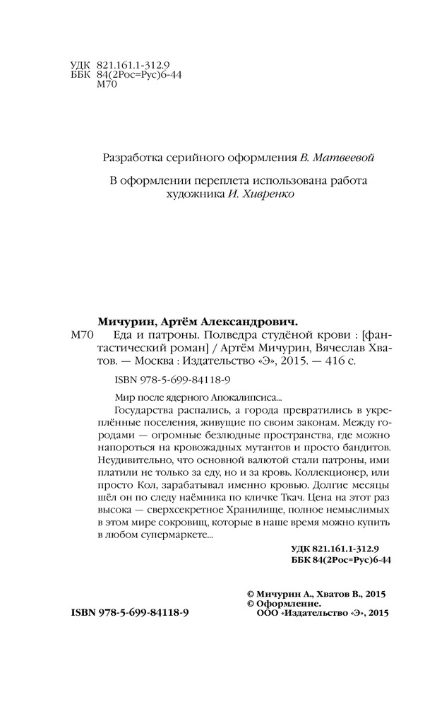 Еда и патроны. Полведра студёной кровиХватов Вячеслав, Мичурин Артем В данный момент этот товар отсутствует в продаже. Возможно, у нас найдется аналогичный или похожий товар здесь. Серия: Новый фантастический боевик Мир после ядерного Апокалипсиса… |