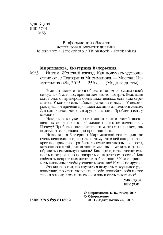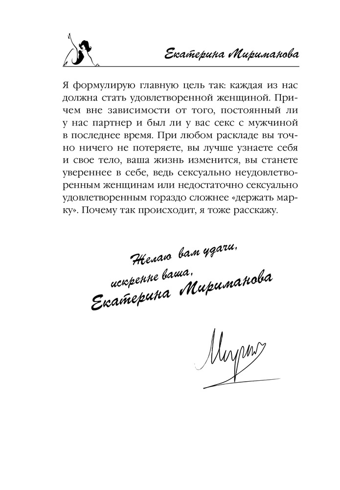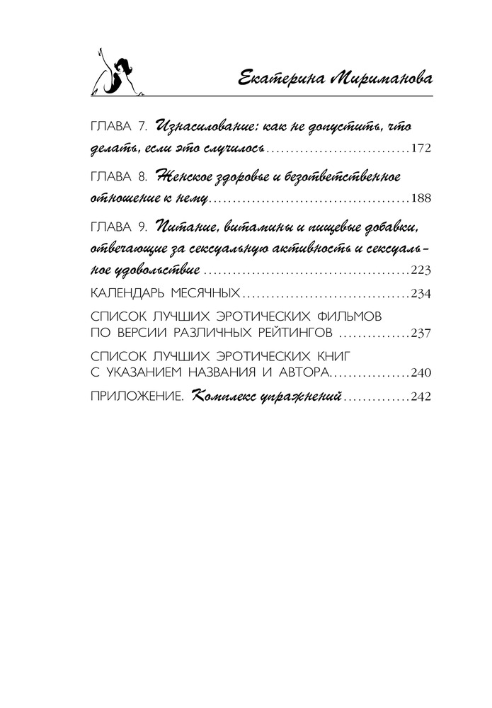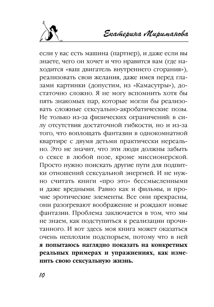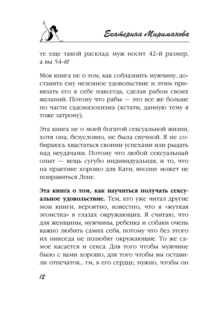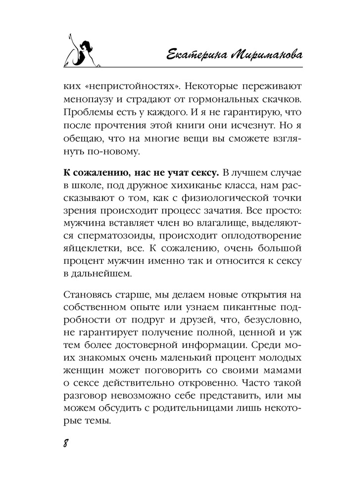 Новая книга Екатерины Миримановой станет для вас очень неплохим подспорьем, потому что в ней автор на конкретных примерах разбирает самые популярные вопросы, касающиеся этой деликатной темы: как изменить и разнообразить сексуальную жизнь? Как преодолеть стеснительность и откровенно поговорить с партнером о сексе? Как избежать неприятных женских заболеваний? Какие принимать витамины, чтобы увеличить желание? И многие другие.