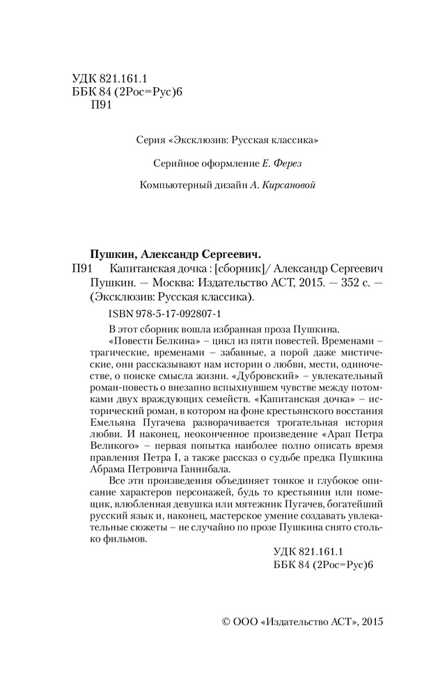 Книга пришла целая, при транспортировке не пострадала, в идеальном состоянии. Помимо «Капитанской Дочки» содержит «Повести покойного И.П.Белкина», «Арап Петра Великого», «Дубровский».
