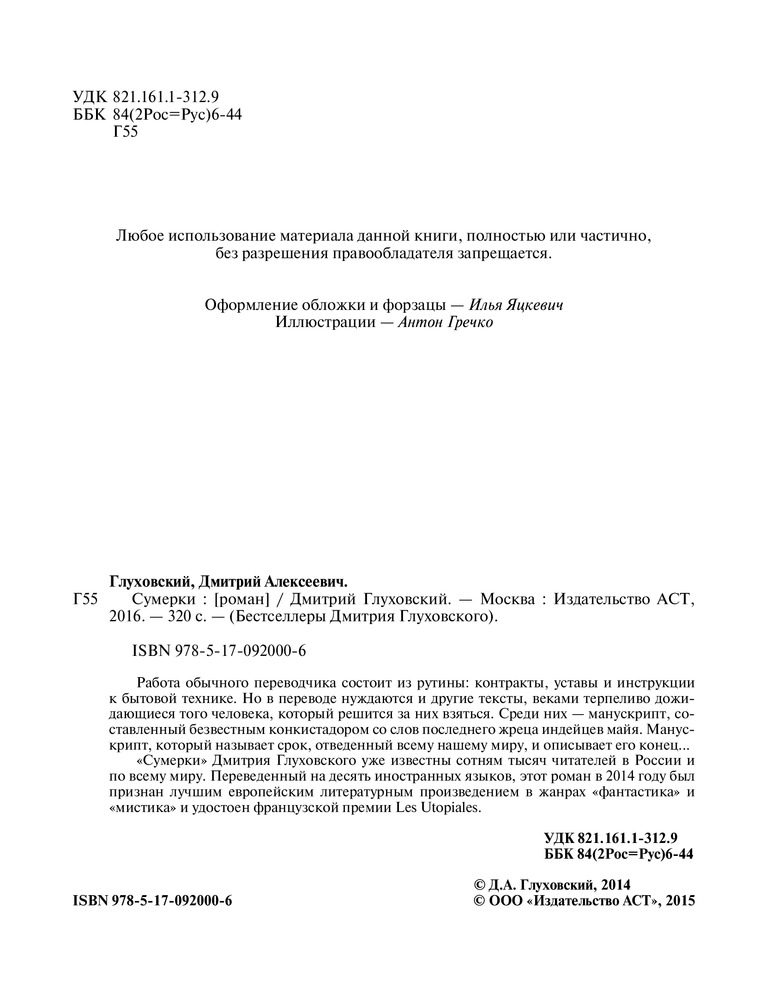 💳 Оплатить за товар можно при получении 🇰🇿 Есть бесплатная доставка по Казахстану от 1 дня 🎁 Копите бонусы с каждой покупки Серия: Бестселлеры Дмитрия Глуховского Работа обычного переводчика состоит из рутины: контракты, уставы и инструкции к бытовой технике. Но в переводе нуждаются и другие тексты, веками терпеливо дожидающиеся того человека, который решится за них взяться. Среди них — манускрипт, составленный безвестным конкистадором со слов последнего жреца индейцев майя. Манускрипт, который называет срок, отведённый всему нашему миру и описывает его конец. |