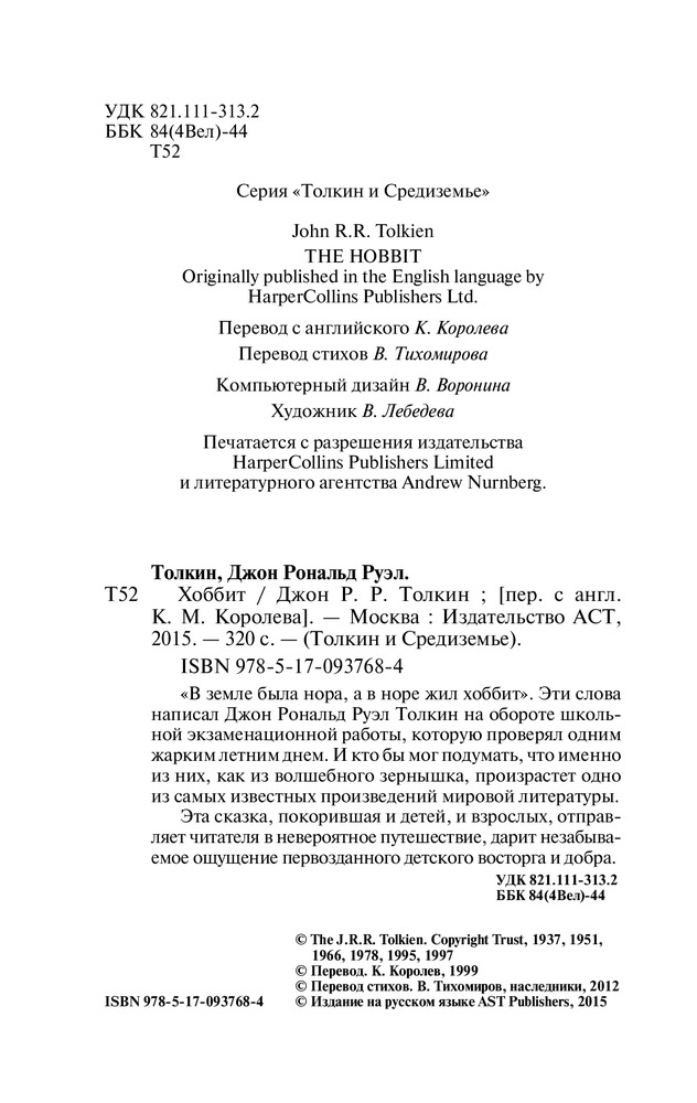 💳 Оплатить за товар можно при получении 🇰🇿 Есть бесплатная доставка по Казахстану от 1 дня 🎁 Копите бонусы с каждой покупки «В земле была нора, а в норе жил хоббит». Эти слова написал Джон Рональд Руэл Толкин на обороте школьной экзаменационной работы, которую проверял одним жарким летним днем. И кто бы мог подумать, что именно из них, как из волшебного зернышка, произрастет одно из самых известных произведений мировой литературы. |