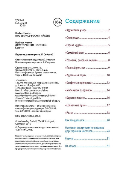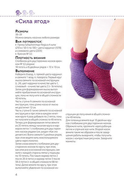 Двусторонние носочки (крючок)В данный момент этот товар отсутствует в продаже. Возможно, у нас найдется аналогичный или похожий товар здесь. Двусторонние модели — это всегда очень необычно, красиво и удобно, а самое приятное то, что, связав одну вещь, вы на самом деле получаете две! Лицевая и изнаночная стороны изделия могут быть разных цветов и с различными, зеркально отображенными узорами — смотрятся они одинаково эффектно! Для многих рукодельниц будет неожиданностью узнать, что двусторонние вещицы можно вязать крючком. Освоить эту оригинальную и уникальную технику можно на таком практичном предмете гардероба, как носочки, — ведь тогда вашим ножкам будет в два раза теплее! |