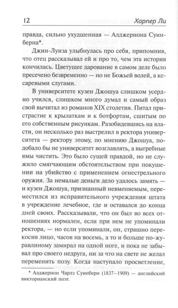 Вся эта путаница с "сиквелами" и "приквелами", как говорится, пришлась как нельзя кстати. Для меня теперь история округа Мэйкомб и семьи Финч в частности завершена. Данная книга одновременно похожа и не похожа на предшественницу (каждый сам решит для себя в чем именно) и имеет свои плюсы и минусы (собственно как и любая другая книга). Впечатления я получила от ИСТОРИИ самые положительные, однако очень-очень огорчил ПЕРЕВОД (иногда читать было просто невозможно). Однако, если трудности перевода Вас не пугают, читайте - не пожалеете. З.Ы. Особенно "зайдет" подросткам.