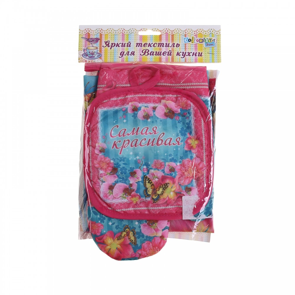 Collorista Кухонный комплект «Самая красивая» (фартук 50х70, варежка-прихватка 18х28, прихватка 17х17)В данный момент этот товар отсутствует в продаже. Возможно, у нас найдется аналогичный или похожий товар здесь. Кухонный набор защитит ваши руки от ожогов, одежду от загрязнений, а также станет оригинальным дополнением к интерьеру вашей кухни. Теперь готовить станет намного приятней. Яркая расцветка поднимет настроение и вдохновит на создание кулинарных шедевров. Изделия изготовлены из плотного, прочного материала. Они легко переносят стирку и глажку, к тому же не требуют каких-либо дополнительных чистящих средств. Рисунки нанесены стойкими безопасными красителями, которые в течение длительного времени будут радовать вас насыщенностью цвета и яркостью. |