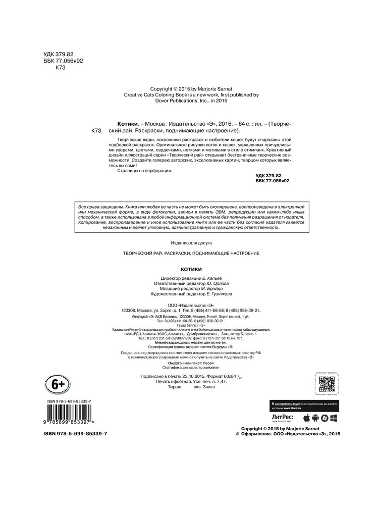 Очень интересные картинки, будоражат фантазию, требуют много ярких цветов. Из этой серии пожалуй котики и совы лучшие. Листы без печати на обратной стороне, перфорированные, чтобы можно было оторвать и повесить в рамку. Обложка твердая, шелковистая на ощупь, некоторые детальки выделены глянцем.