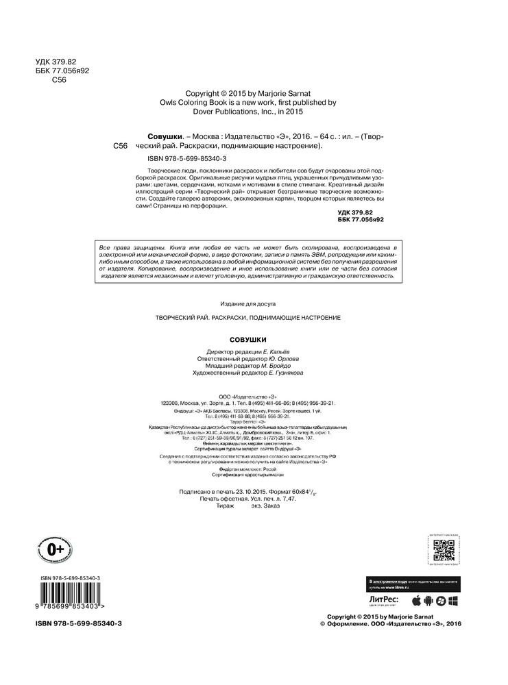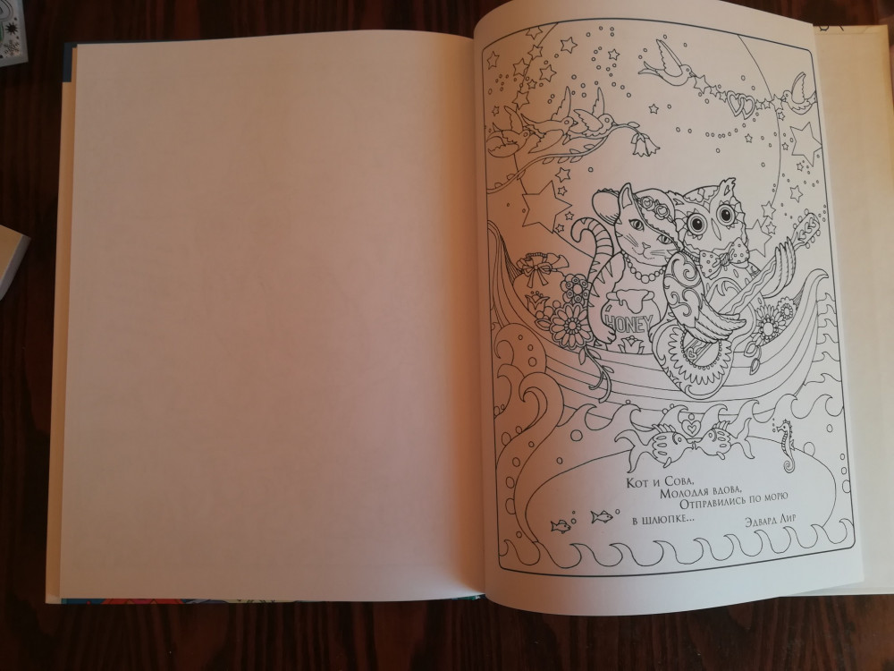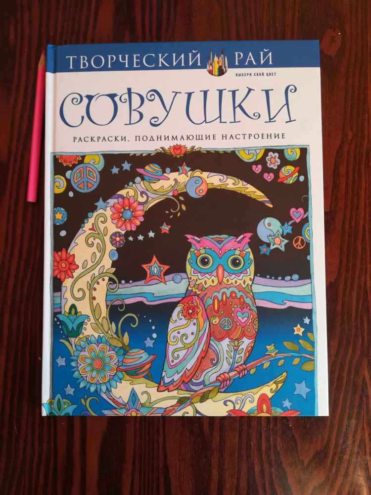Большая книга, в очень качественном, жестком переплёте(красивом)! Раскраска располагается на одной стороне разворота, что удобно! Раскрасок много! Качественные,с тонким контуром. Единственное, что мне показалось-мордочки у совушек могли бы быть отличающимися. А то все на одну мордашку! А так- книга красивая!