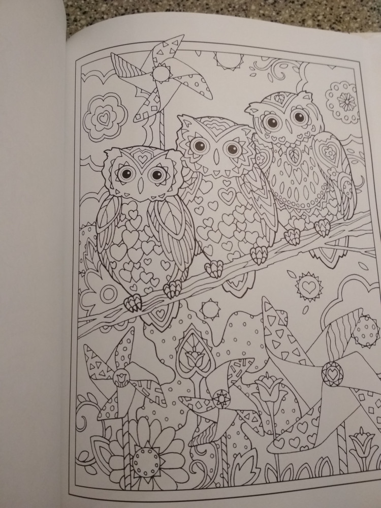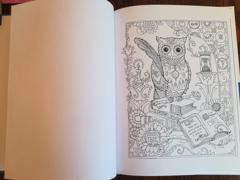 Неплохая раскраска в твердом переплете. Бумага средняя, но так как иллюстрации на одной стороне - это не критично, однако, водные и спиртовые материалы она не выдержит. Совушки очень милые и забавные, мне очень понравились. Раскраска была доставлена с примятым корешком, но это тоже не критично. В целом, все хорошо. Спасибо.