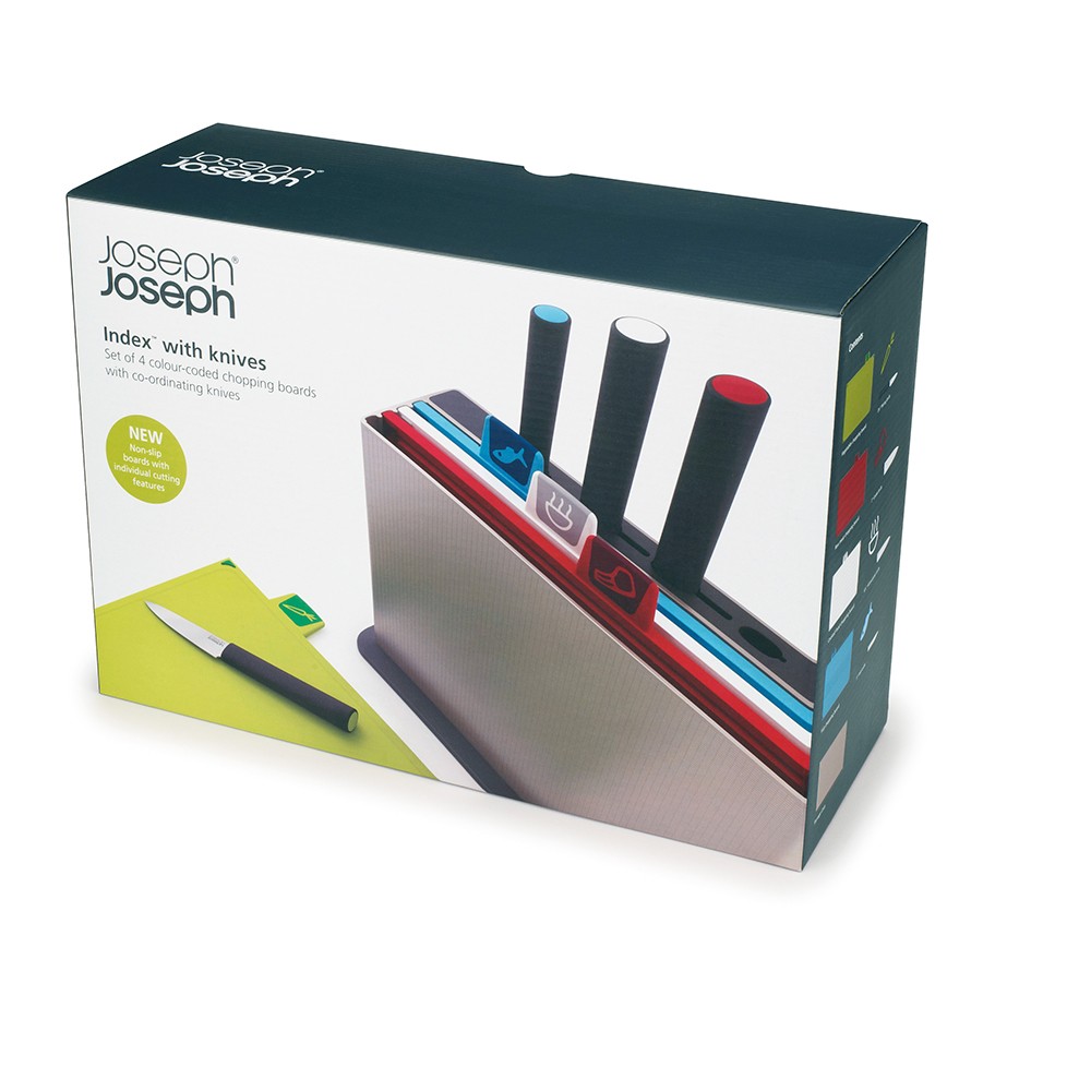 Joseph Joseph Набор разделочных досок с ножами «Index with knives»В данный момент этот товар отсутствует в продаже. Возможно, у нас найдется аналогичный или похожий товар здесь. Серия: Index Набор разделочных досок Index — хит бренда Joseph Joseph с 2008 года, завоевавший множество наград за функциональность и дизайн. Index™ Advance — усовершенствованная и расширенная версия полюбившихся многим и ставших бестселлерами досок из серии Index. Набор состоит из компактного кейса из высококачественного пластика, 4 маркированных разноцветных доски для разного типа продуктов и 4 маркированных ножа также для раздельного применения. Вы легко догадаетесь по ярлычкам на чём резать рыбу, мясо или овощи. Доски двусторонние, с нескользящими подставками с обеих сторон. Выполнены из специального материала, который практически не затупляет ножи и при резке не оставляет микроскопических частиц на пище (в отличие от деревянных и обычных пластиковых досок). |
