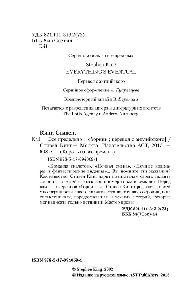 💳 Оплатить за товар можно при получении 🇰🇿 Есть бесплатная доставка по Казахстану от 1 дня 🎁 Копите бонусы с каждой покупки Серия: Король на все времена «Команда скелетов». «Ночная смена». «Ночные кошмары и фантастические видения». Вы помните эти названия? Как известно, Стивен Кинг дарит почитателям своего таланта сборник повестей и рассказов примерно раз в семь лет. Перед вами — очередной сборник, где Стивен Кинг предстает во всей многогранности своего таланта. Это настоящая сокровищница увлекательных, парадоксальных и темных историй, которые мог написать только истинный Мастер прозы. |