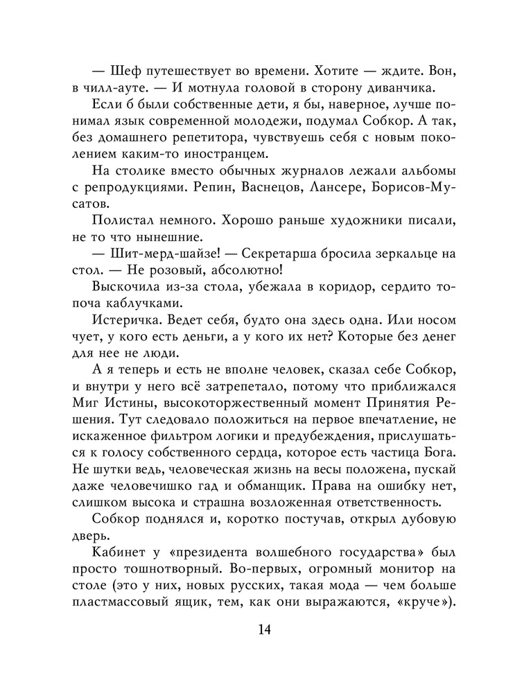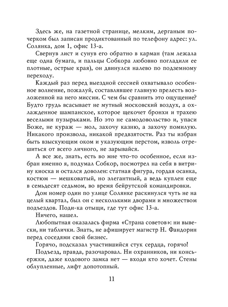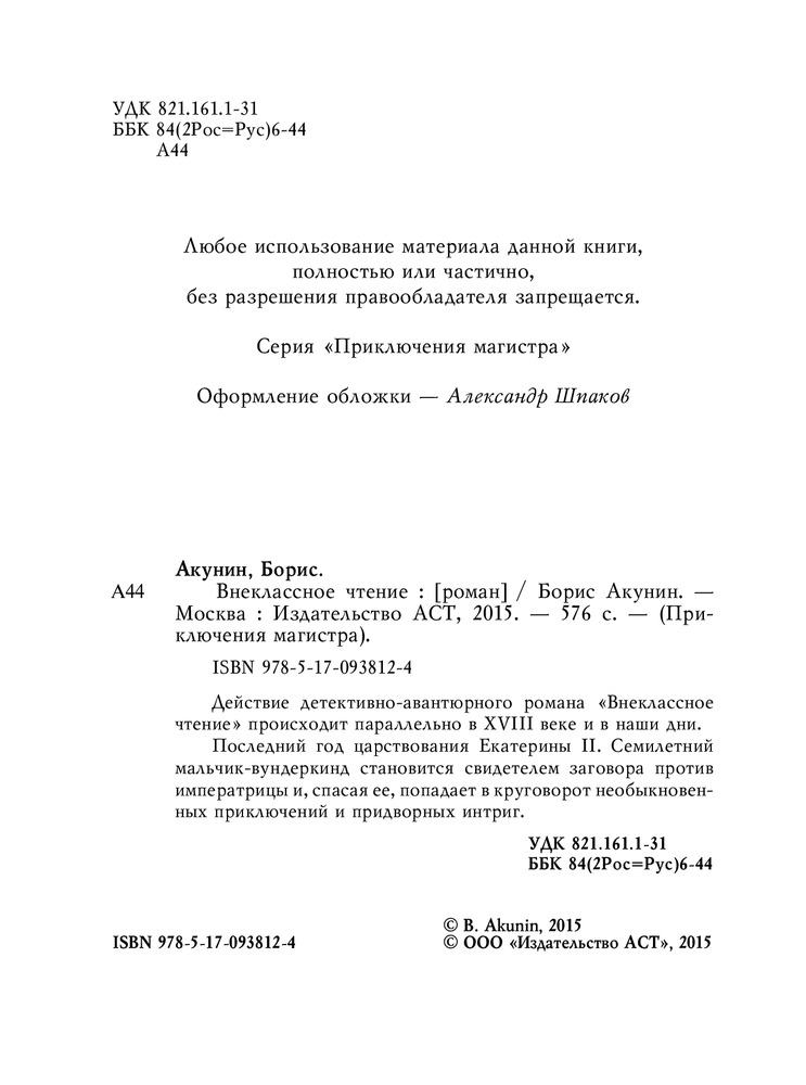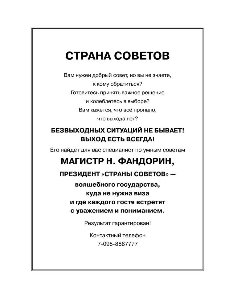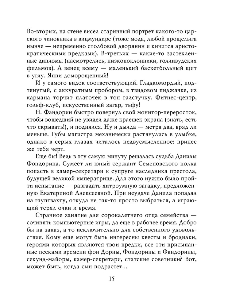 В книге поочередно переплетаются 2 сюжетные линии: одна глава 21 век, другая 18 век, и т.д., между собой почти не связаны, по мне так удобнее было бы сначала одну историю почитать, потом другую, а то в голове каша от двух параллельных миров. Та часть, которая про 18 век ещё больше походит на стиль Акунина: там Фандорин привычный ловкач, на все руки мастер и философ. Часть про 21 век прям копия Донцова: иронический детектив с трансвеститами, дурацкими погонями от бандитов и бестолковым Фандориным, от которого кроме благородства ничего не осталось. В общем, по сюжету так себе. Формат покетбука не очень удобный, т.к. 600 страниц в мягком переплете маленького формата держать неудобно, бумага очень серая, иллюстраций нет.