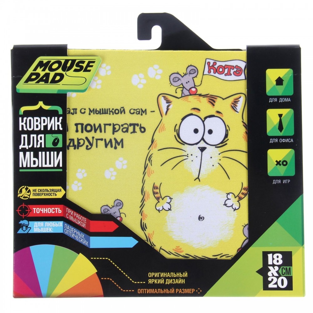 КОТЭ Коврик для мышки «Поиграл с мышкой сам - дай поиграть другим»В данный момент этот товар отсутствует в продаже. Возможно, у нас найдется аналогичный или похожий товар здесь. Коврик для мышки «Поиграл с мышкой сам — дай поиграть другим « — функциональный и яркий аксессуар для вашего стола, который сохраняет поверхность столешницы гладкой и защищает её от царапин. Он обеспечивает точность в работе с мышкой и делает перемещение курсора более динамичным. Оптимальный размер подходит для работы и, конечно же, для игр. |