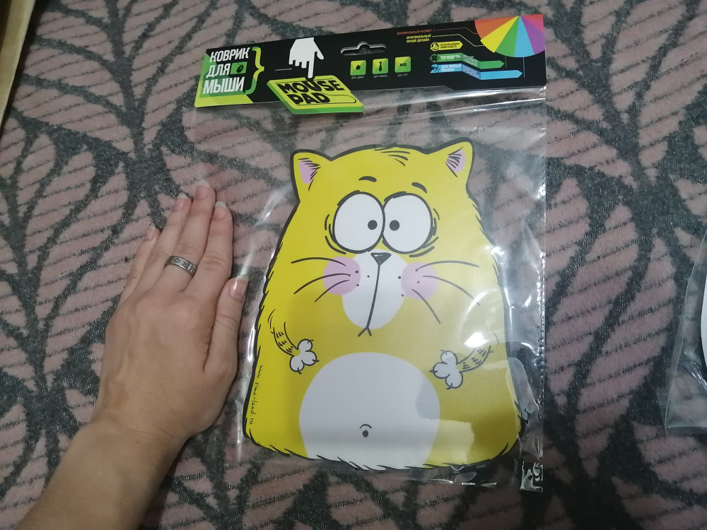 Коврик небольшой, но мышка с рукой помещаются) Брала в подарок. В целом очень яркий и необычный, одна коробка чего стоит)