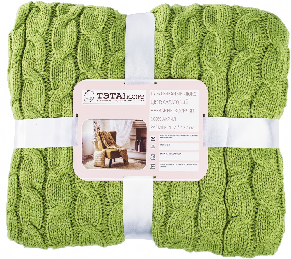 Плед неплохой. Цвет один в один, как на главной картинке, не салатовый, а спелого яблока (теплый зеленый). Единственное, вязка на мой взгляд рыхловата, я ожидала плотнее, ну и размер маленький достаточно. На диван или кровать будет мал.