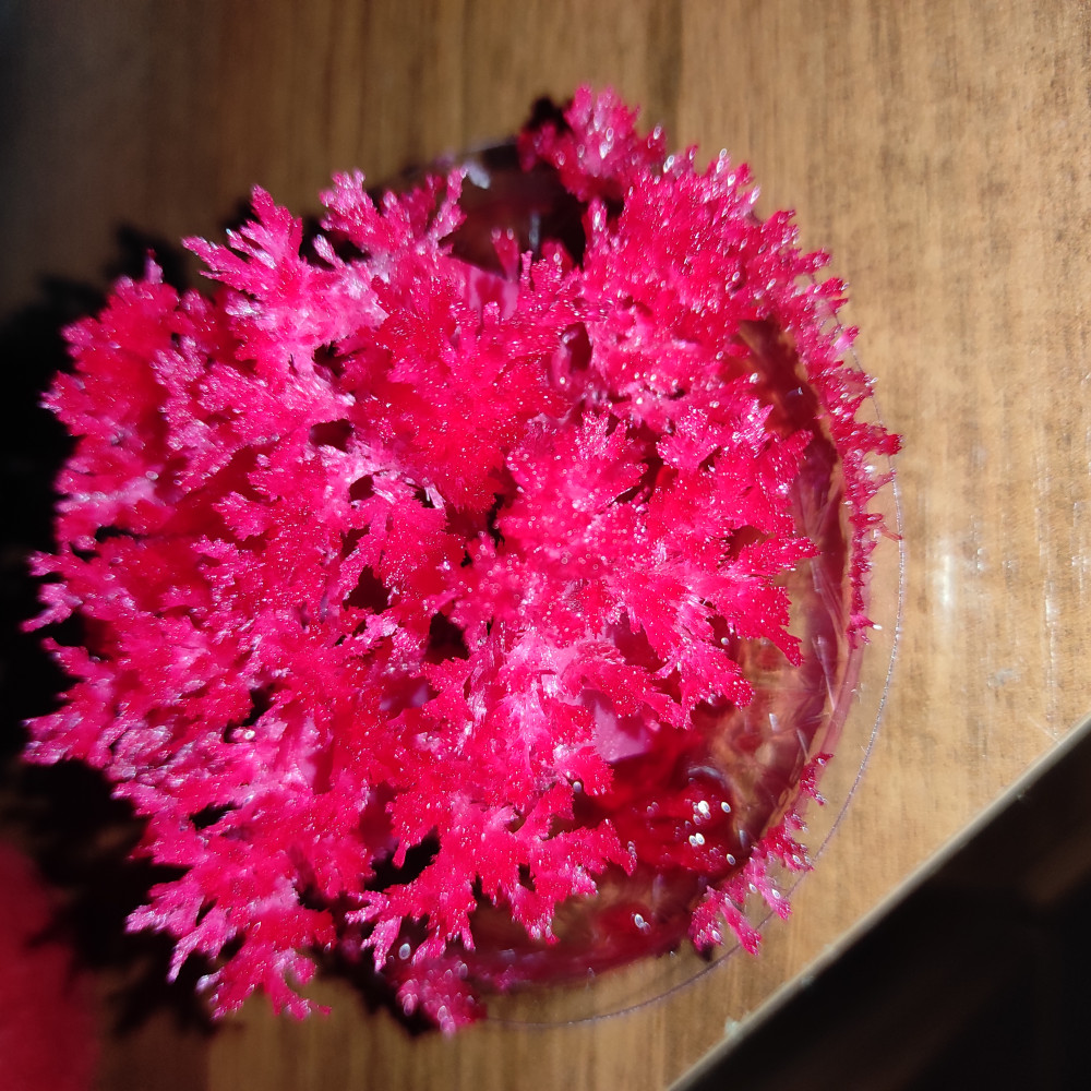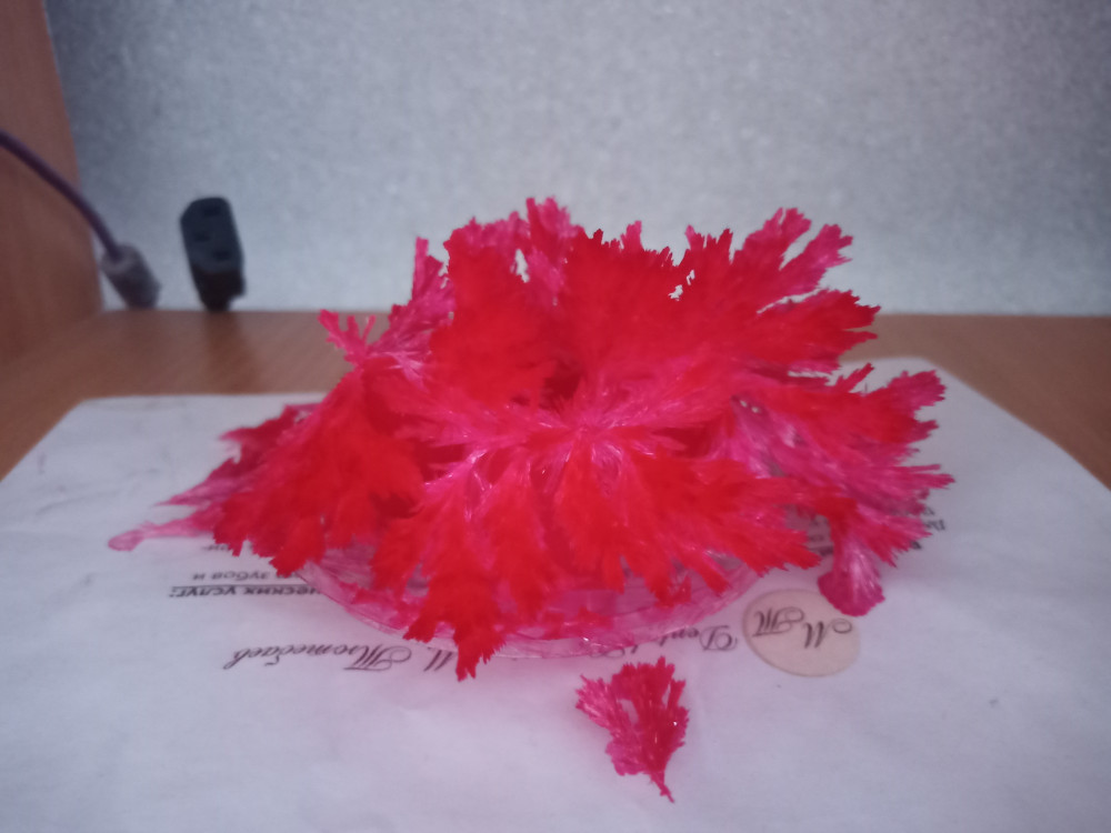 Кристалл вырос быстро! Вечером сделали, с утра уже были первые "веточки". В течение дня вся жидкость впиталась и он стал максимально пушистым. Ребёнку 6-ти лет было очень интересно наблюдать. Цвет яркий. Кристалл хрупкий.