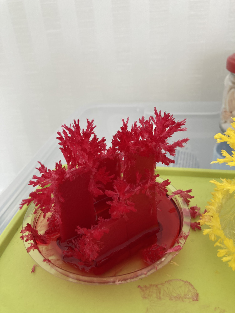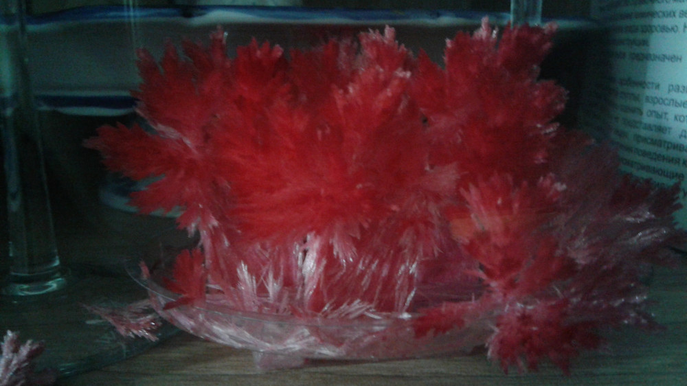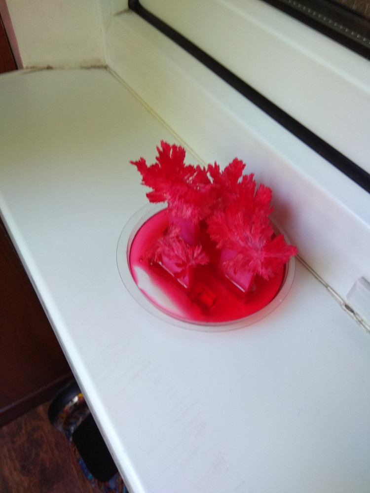 Интересно наблюдать как растет кристалл, потом высыхает и стоит радует глаз, только очень хрупкий, ломается.