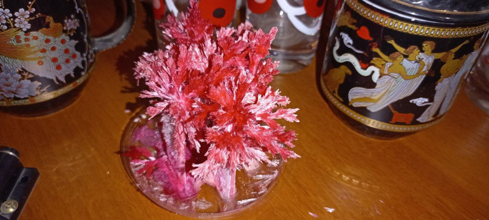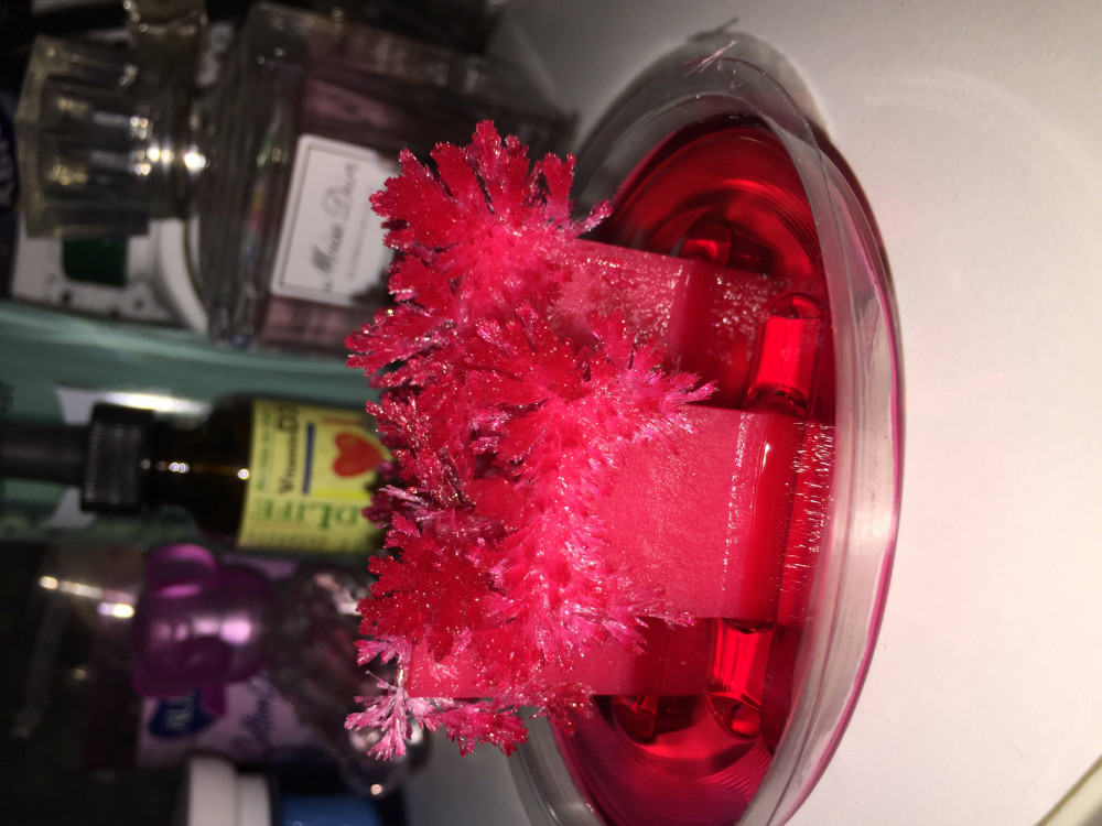 Кристалл растёт быстро. Через несколько часов появились первые отросточки, через двое суток полностью готов. Единственное, я не поняла, зачем оставлять часть жидкости на высыхание. Она в том бутылёчке так и не высохла, я оставшуюся жидкость долила в поддон дня через 3.