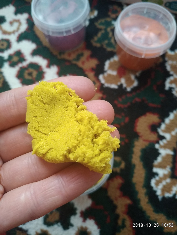 Песок фиолетового цвета сильно липнет к рукам и после тяжело отмывается. Другие цвета нормально, запах приятный, не высыхает, но мы долго на воздухе не держим. Один раз на пол дня остался и ничего - как новый.