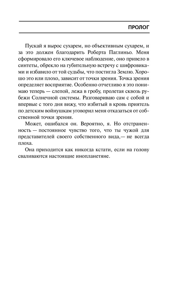 В начале может показаться, что книга занудная и скучная. Но это произведение относится к разряду тех, что раскрываются в полной мере после примерно сороковой страницы. Огромное преимущество состоит в том, что эта книга написана во время, когда уже стал ясен приблизительный вектор развития существующих технологий, и к тому же стиль автора неповторим и очень своеобразен. Сюжет захватывает с головой, и если Вам нравится научная фантастика, и вы уже успели ознакомиться со всем интересным в пласте "классической" космооперы, то эта книга - то, что Вам необходимо. Книга изначально кажется очень сложной, т. к. изобилует научными терминами и понятиями, но такой подход оправданный в полной мере реалистичностью происходящего. Когда Вы вольётесь в книгу полностью, она вас уже не отпустит до самого конца. По сути, это - один из лучших представителей твердой научной фантастики за последние пару десятилетий, написанный настоящим ученым, и содержащий в себе глубочайшие мысли, идеи, и обладающий прекрасным сюжетом. В целом, это одна из немногих книг, которые действительно стоят покупки. Я начал читать её в электронном формате, и примерно в середине процесса четко осознал, что эта книга должна и обязана стоять на моей полке вместе с книгами Желязны, Брэдбери, Хайнлайна, Азимова, Лема и других выдающихся фантастов.