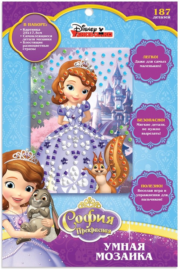В данный момент этот товар отсутствует в продаже. Возможно, у нас найдется аналогичный или похожий товар здесь. На красочной основе мозаики «София прекрасная» находятся выделенные места для размещения там 187 разнообразных пайеток и сверкающих страз. Картинка, изображающая юную принцессу Софию, итак вполне красива, а украшенная полимерными элементами, она станет еще более привлекательной. Все декоративные фигурки снабжены клеевым слоем, поэтому их нужно только отклеить от основы и поместить на подходящее место рисунка.