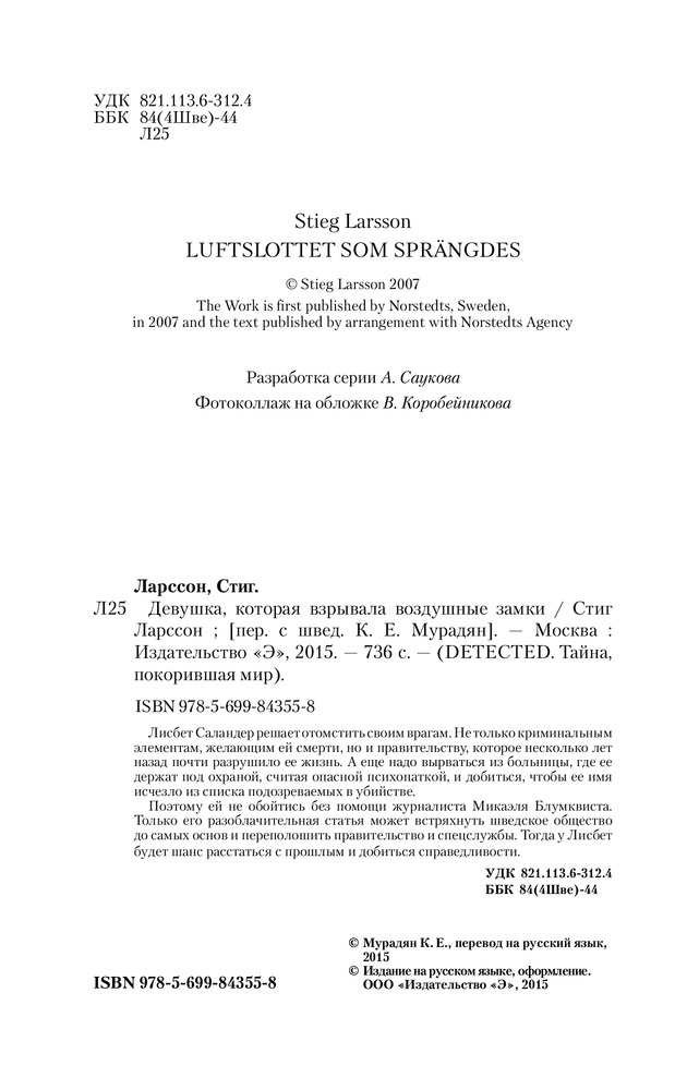 Девушка, которая взрывала воздушные замкиВ данный момент этот товар отсутствует в продаже. Возможно, у нас найдется аналогичный или похожий товар здесь. Серия: DETECTED. Тайна, покорившая мир Лисбет Саландер решает отомстить своим врагам. Не только криминальным элементам, желающим ей смерти, но и правительству, которое несколько лет назад почти разрушило ее жизнь. А еще надо вырваться из больницы, где ее держат под охраной, считая опасной психопаткой, и добиться, чтобы ее имя исчезло из списка подозреваемых в убийстве. |