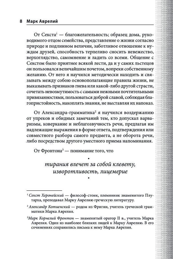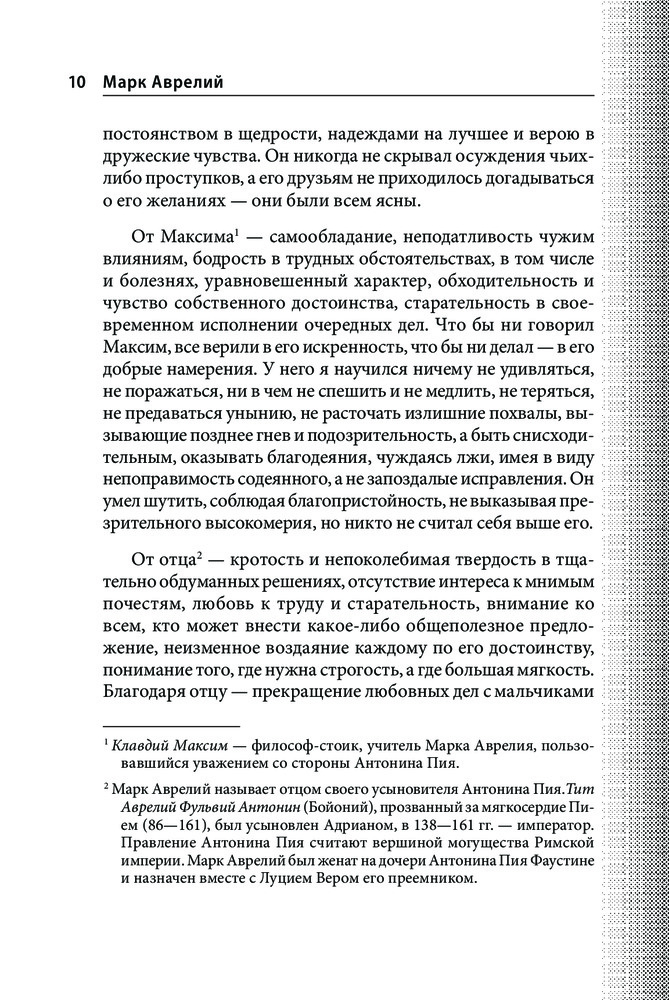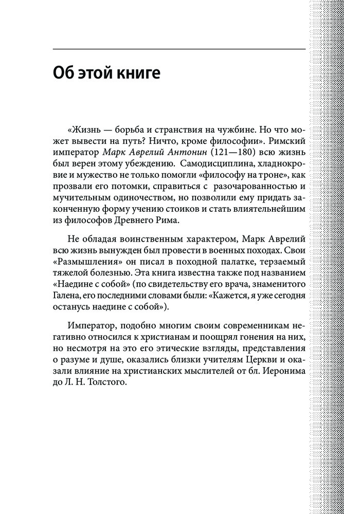 💳 Оплатить за товар можно при получении 🇰🇿 Есть бесплатная доставка по Казахстану 🎁 Копите бонусы с каждой покупки Серия: Великие личности Самодисциплина, хладнокровие, мужество не только помогли римскому императору Марку Аврелию Антонину (121–180), или, как его прозвали потомки, «философу на троне», справиться с тяготами походной жизни, неприятием войны и муками одиночества, но позволили ему придать законченную форму учению стоиков и стать влиятельнейшим из философов Древнего Рима. Он, древнеримский правитель, противник — и пусть и относительно умеренный, но все же последовательный гонитель,- христиан, стал для Учителей Церкви одним из самых цитируемых авторов и оказал влияние на всех христианских мыслителей от блаженного Иеронима до |