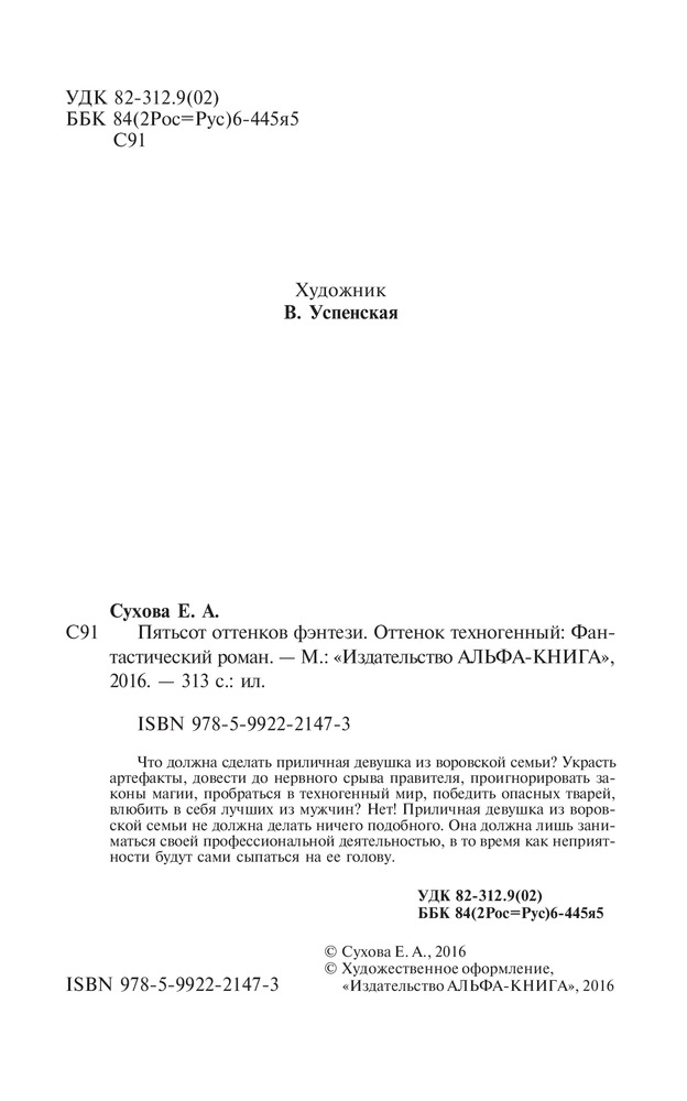 Пятьсот оттенков фэнтези. Оттенок техногенныйВ данный момент этот товар отсутствует в продаже. Возможно, у нас найдется аналогичный или похожий товар здесь. Серия: Юмористическая серия Что должна сделать приличная девушка из воровской семьи? Украсть артефакты, довести до нервного срыва правителя, проигнорировать законы магии, пробраться в техногенный мир, победить опасных тварей, влюбить в себя лучших из мужчин? Нет! Приличная девушка из воровской семьи не должна делать ничего подобного. Она должна лишь заниматься своей профессиональной деятельностью, в то время как неприятности будут сами сыпаться на ее голову. |